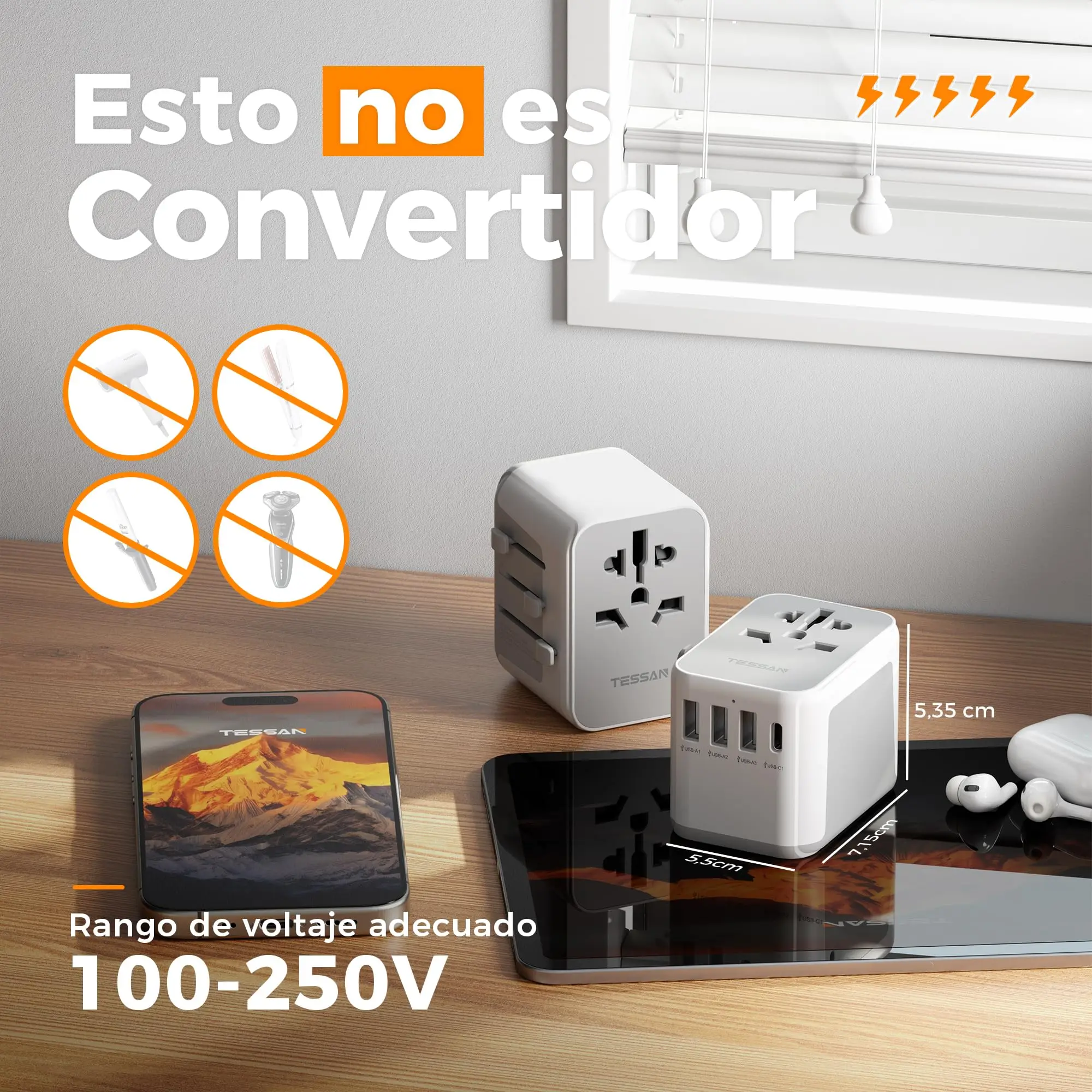 Este no es un convertidor. Este enchufe de viaje solo es adecuado para dispositivos con dos voltajes o dispositivos globales con un rango de voltaje de entrada de 100 a 250 V. La conversión de voltaje (transformación) o el cambio de frecuencia de la red no se realiza mediante este adaptador de enchufe.