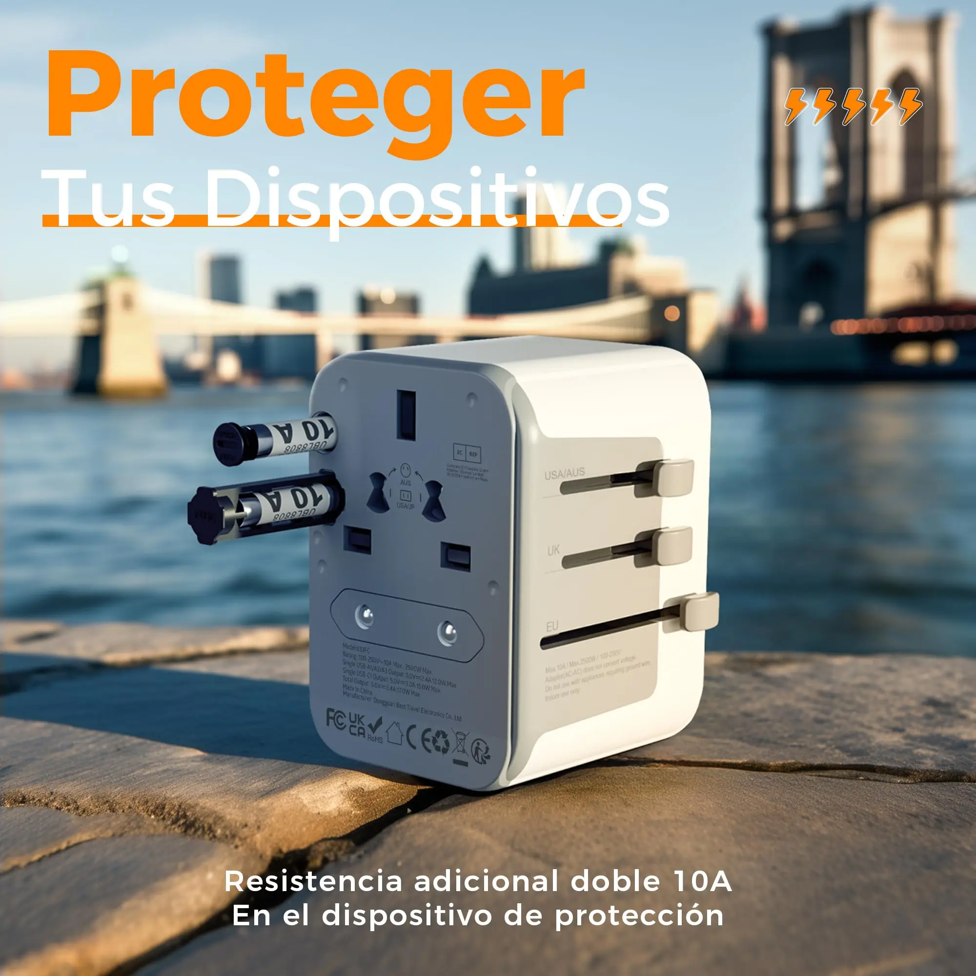 Este adaptador de viaje viene con dos fusibles de sobrecarga (10A).Si el fusible está dañado, puede reemplazarlo con un fusible de repuesto.La doble protección hace que su viaje sea más seguro.