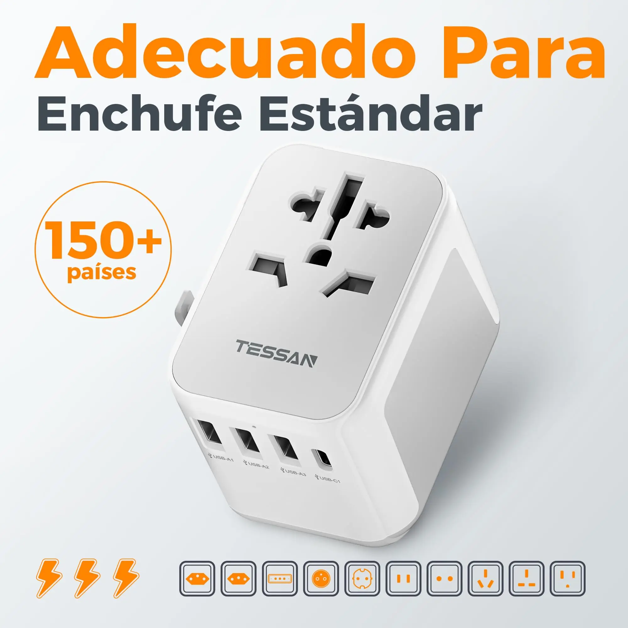 2 puertos USB A (salida USB total 5 V/2,4 A MAX) 3 adaptadores de viaje USB C (salida total: 5 V/3 A) y 1 toma de CA (admite 100 a 250 V, 50/60 Hz, máx.Carga 10 A. Máx.Potencia 2500 W a 250 VCA, 1100 W a 110 VCA).Con el adaptador de viaje TESSAN podrás cargar 6 dispositivos al mismo tiempo.