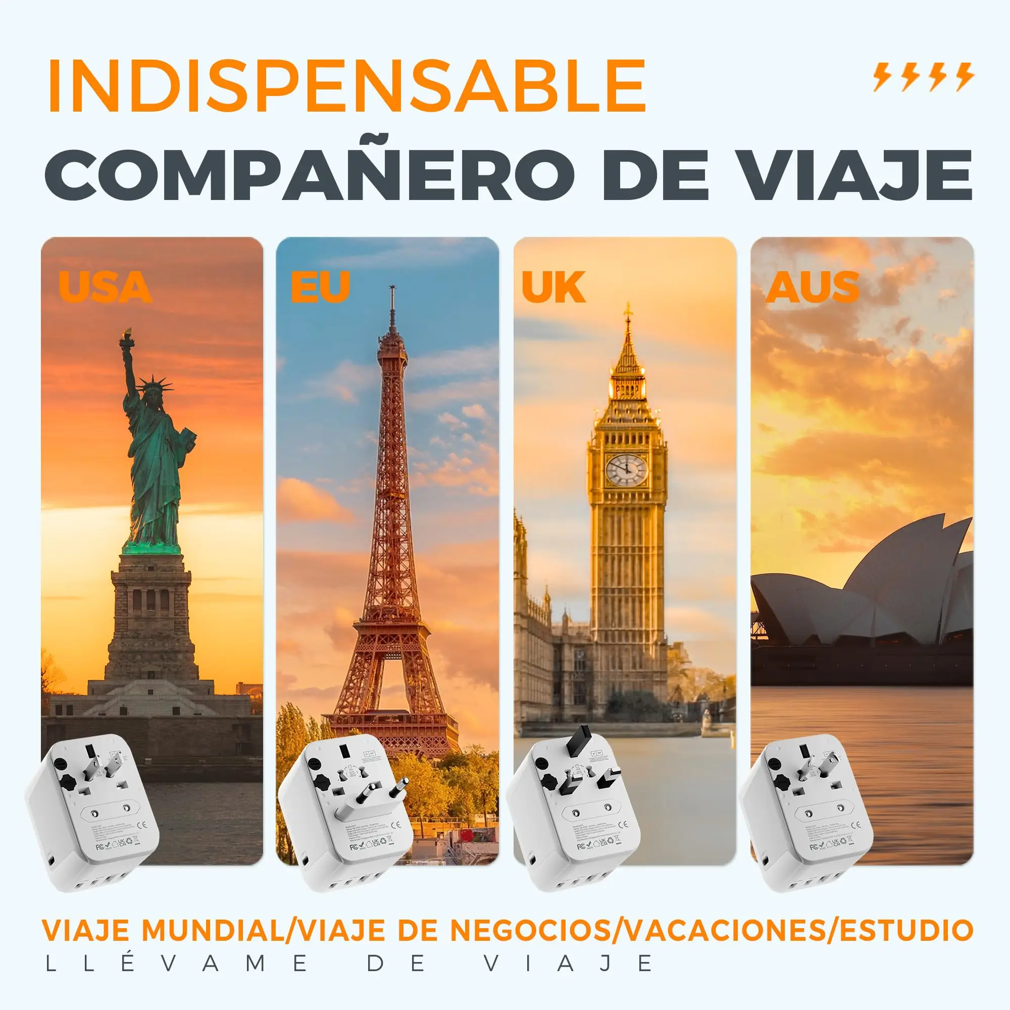 Este adaptador de viaje universal en todo el mundo tiene un enchufe UE/REINO UNIDO/AU/EE. UU.Con este adaptador de viaje podrás viajar a muchos países, como Europa, EE. UU., Inglaterra, Alemania, Asia, Tailandia, Australia, China, Japón, Israel, Italia, Colombia, etc.