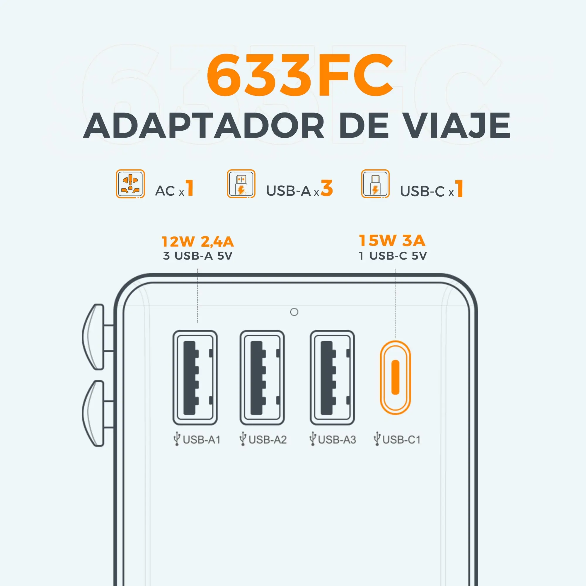3 puertos USB A (salida USB total 5 V/2,4 A MAX) 1 puerto USB C (salida total: 5 V/3 A) y 1 toma de CA (admite 100-250 V, 50/60 Hz, máx.Carga 10 A. Máx.Potencia 2500 W a 250 VCA, 1100 W a 110 VCA).Con este adaptador de enchufe internacional, puedes cargar 5 dispositivos al mismo tiempo.