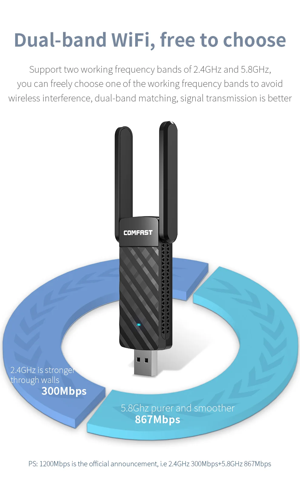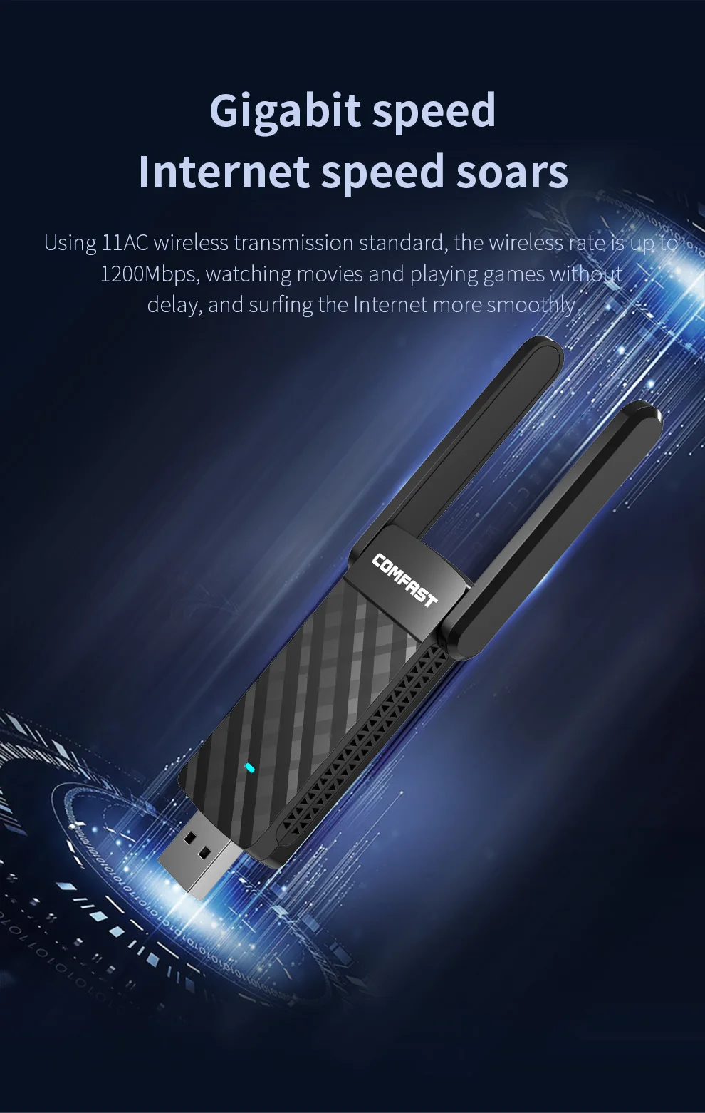 Adaptador WiFi Comfast 2.4G y 5G USB3.0 unidad libre WiFi Dongle AC1200 tarjeta de red inalámbrica para modo de monitor Win XP/7/8/10/11 Kali Linux