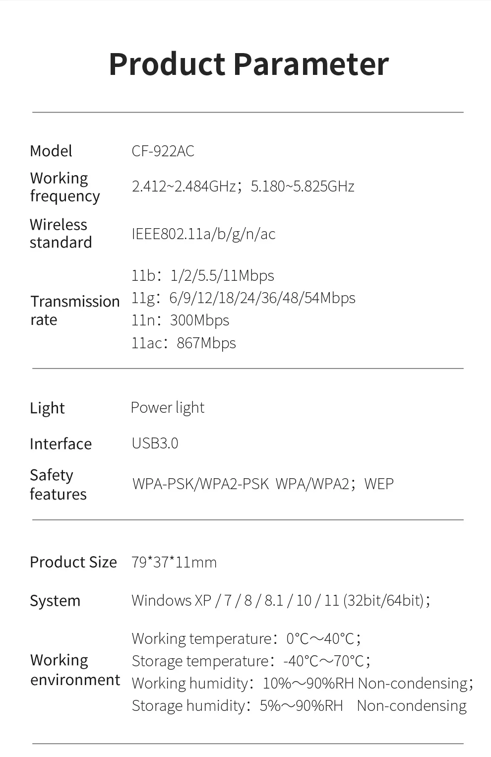Especificaciones:Tarjeta de red inalámbrica y dual de 1200Mbps 11ACAlta velocidad de 1.1200 Mbps: 2,4 G (300 Mbps) + 5 GHz (867 Mbps)2.Estándar inalámbrico IEEE802.11a/b/g/n/ac3.Adaptador inalámbrico USB3.04.Antenas giratorias externas de 2*3dBi5.Compatible con el sistema Windows XP/ 7/8/ 8.1/ 10/11.(Compatible con Mac, el sistema Linux necesita descargar el paquete de instalación de controladores adicionales)6.Admite el modo de monitor Kali LinuxLista de embalaje:1 adaptador inalámbrico de 1300Mbps1 * Manual de usuario en inglés1 * tarjeta de garantía