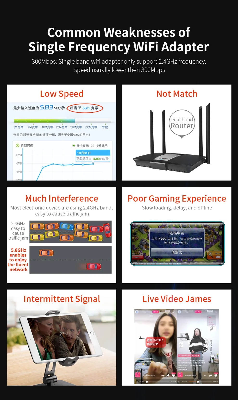 Debilidades comunes del adaptador WiFi de una sola frecuenciaBaja velocidad, no coincide, mucha interferencia, mala experiencia de juego, señal intermitente, video en vivo