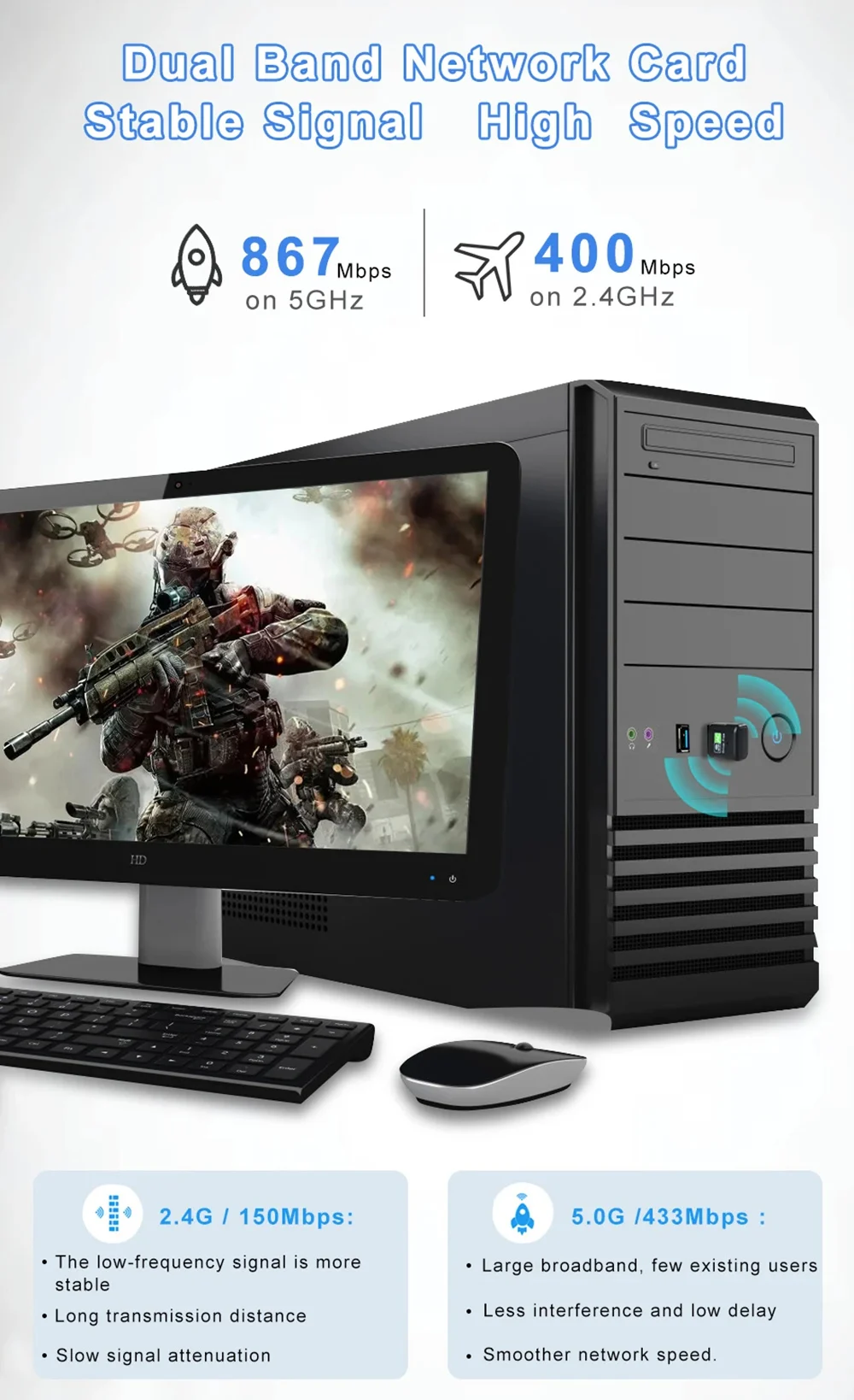 2.Compatibilidad con velocidad de red (velocidad WiFi): 2,4 GHz--150 Mpbs 5,8 GHz--433 Mpbs.