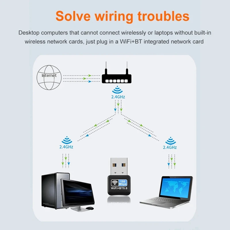Protocolo inalámbrico: el adaptador WiFi USB sigue los estándares y protocolos IEEE 802.11n, IEEE 802,11g, IEEE 802.11b, CSMA/CA con ACK, y la velocidad de transmisión inalámbrica es de hasta 150Mbps.