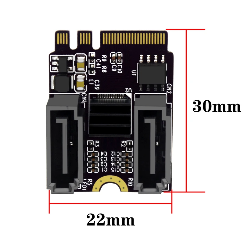 Esta tarjeta adaptadora puede cambiar 2 interfaces SATA a través de la ranura M.2 (tecla A + E) del host del PC, Y el usuario puede conectar 2 unidades de estado sólido SSD o discos duros mecánicos con interfaces SATA al mismo tiempo a través del cable de datos SATA.