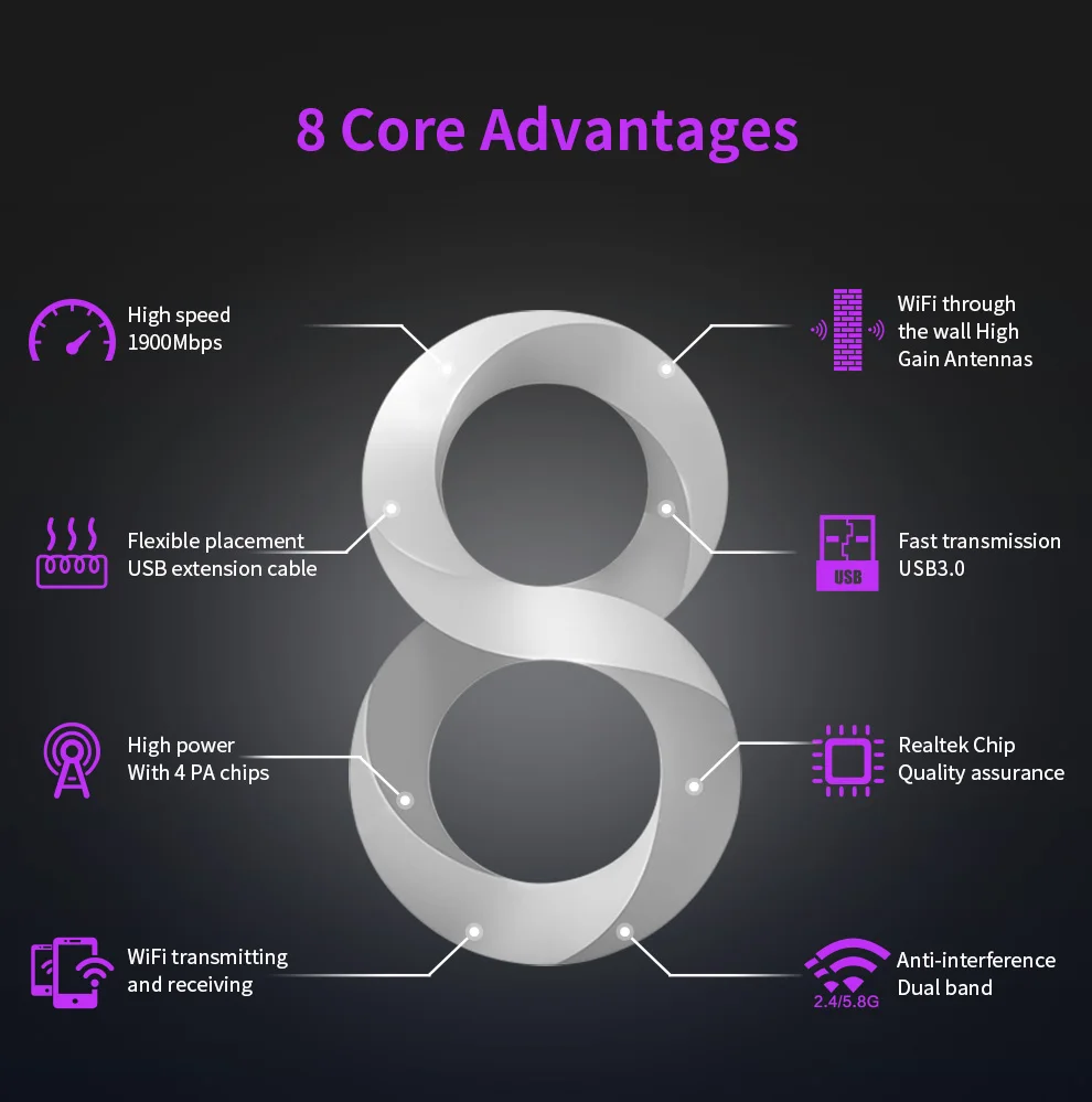 R: 1900Mbps significa 2,4G 600Mbps + 5G 1300Mbps. Y la velocidad inalámbrica se ve afectada por muchos factores, como distancia, obstáculos, interferencias, etc. Póngase en contacto con el servicio de atención al cliente si tiene alguna duda.