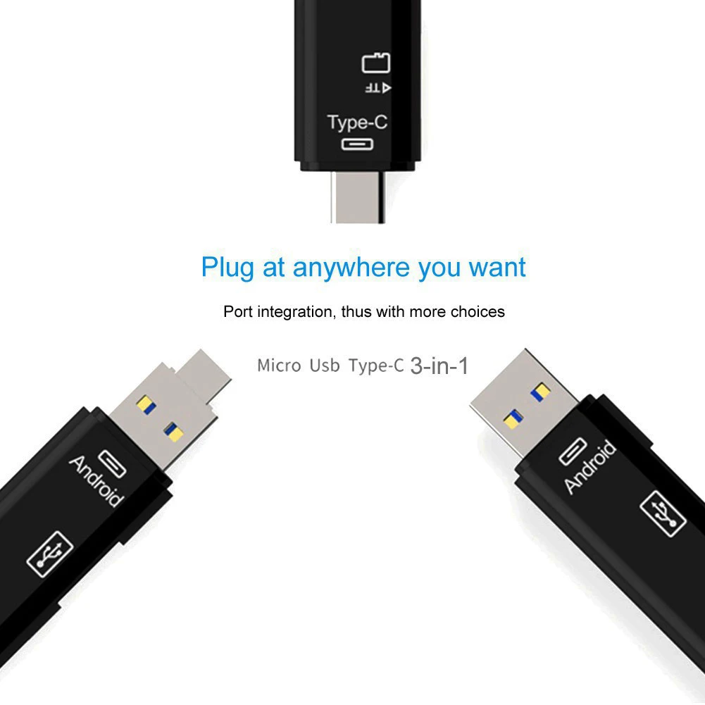 Tamaño del producto: aproximadamente 7,3*1,8*0,9 cm/2,87*0,71*0,35 pulgadasDescripción:Función del producto: USB 2,0 macho + MICRO macho + tipo C macho, Lee rápidamente tarjetas de memoria TF, teclado externo con interfaces USB macho, ratones, discos flash USB, escudos USB, gamepads y otros dispositivos USB.