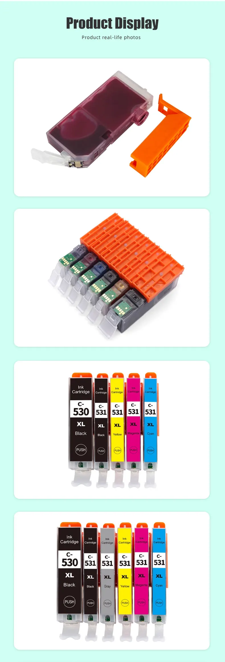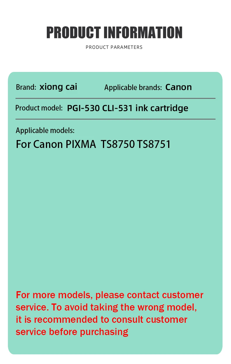 Instrucción del productoNombre del producto: Cartucho de tintaModelo de cartucho: PGI-530 CLI-531 (Europa)Color de tinta: PGBK/BK/C/M/YCapacidad de tinta: PGBK-26.5 ml BK/C/M/Y-12,2 mlImpresoras compatibles: Para Canon PIXMA TS8750 TS8751