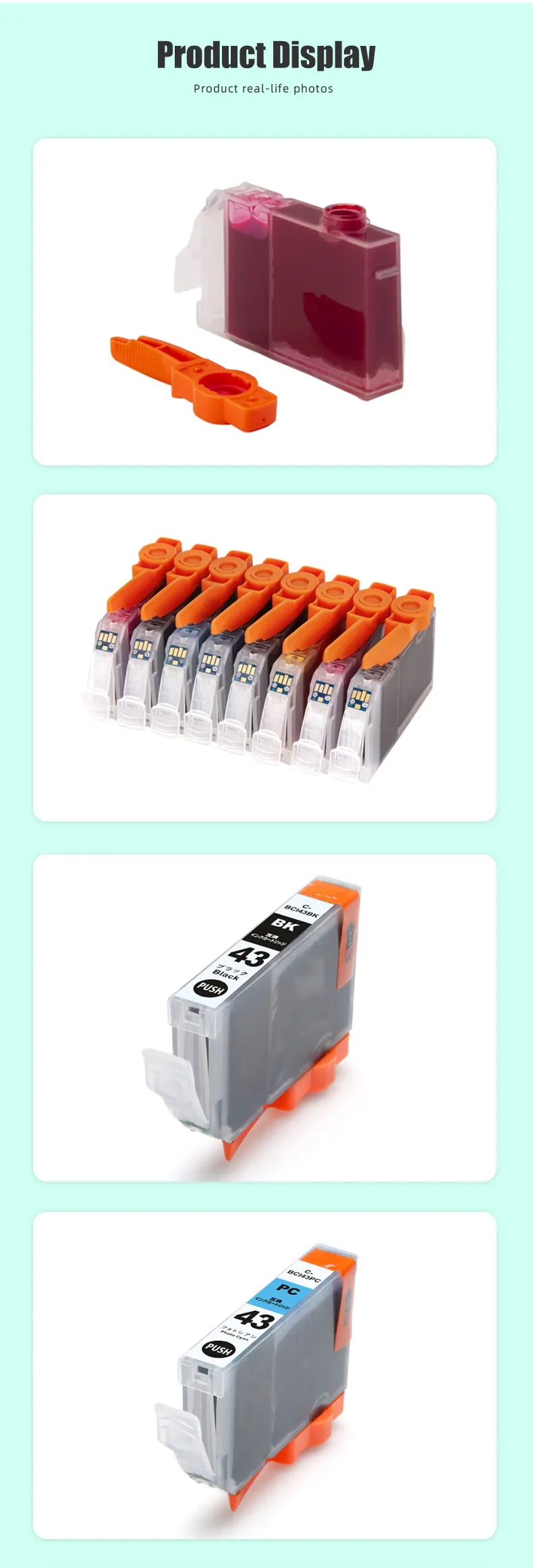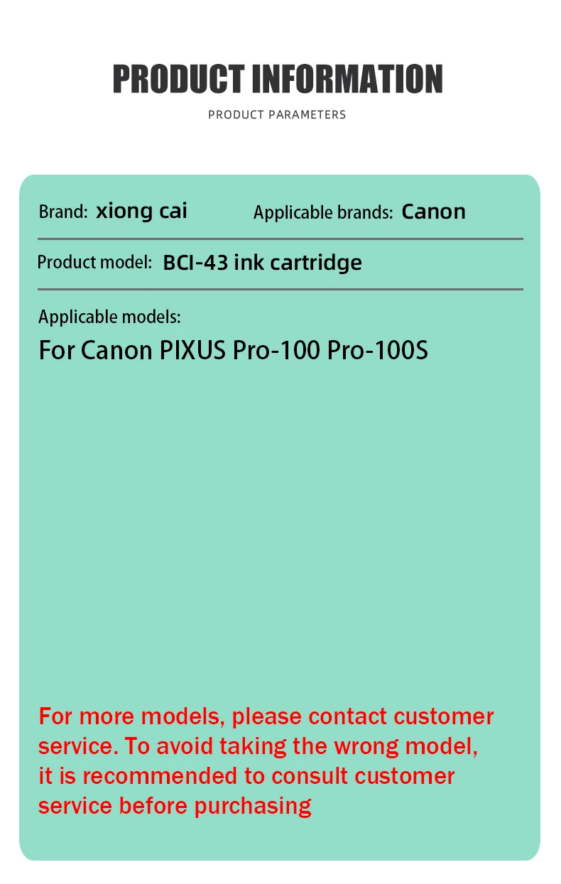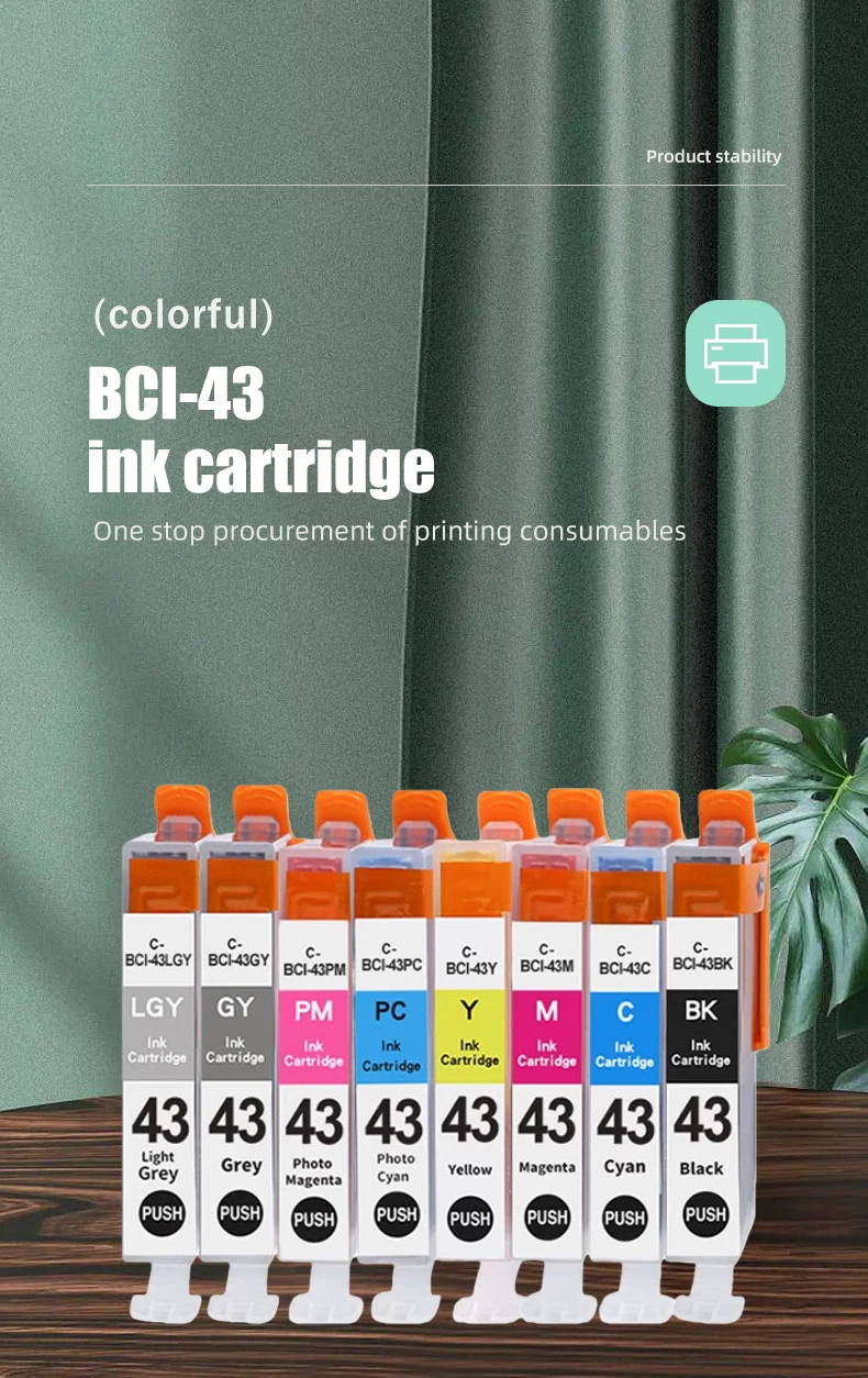 Instrucción del productoNombre del producto: Cartucho de tintaModelo de cartucho: BCI-43 (Japón)Color de tinta: BK/C/M/Y/PC/PM/LGY/GYCapacidad de tinta: 14MLImpresoras compatibles: Para Canon PIXUS Pro-100 Pro-100S