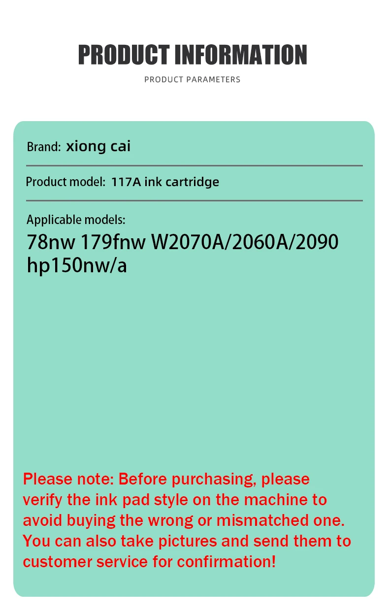 Nombre del producto: cartucho de tóner Número de cartucho: W2070A / 117A Color: negro, cian, magenta, amarillo Página de impresión: BK 1500 páginas C M Y 1000 páginas 【Papel A4, prueba de cobertura del 5 %】 Modo adecuado: para HP MFP 178nw 179fnw 150a 150nw