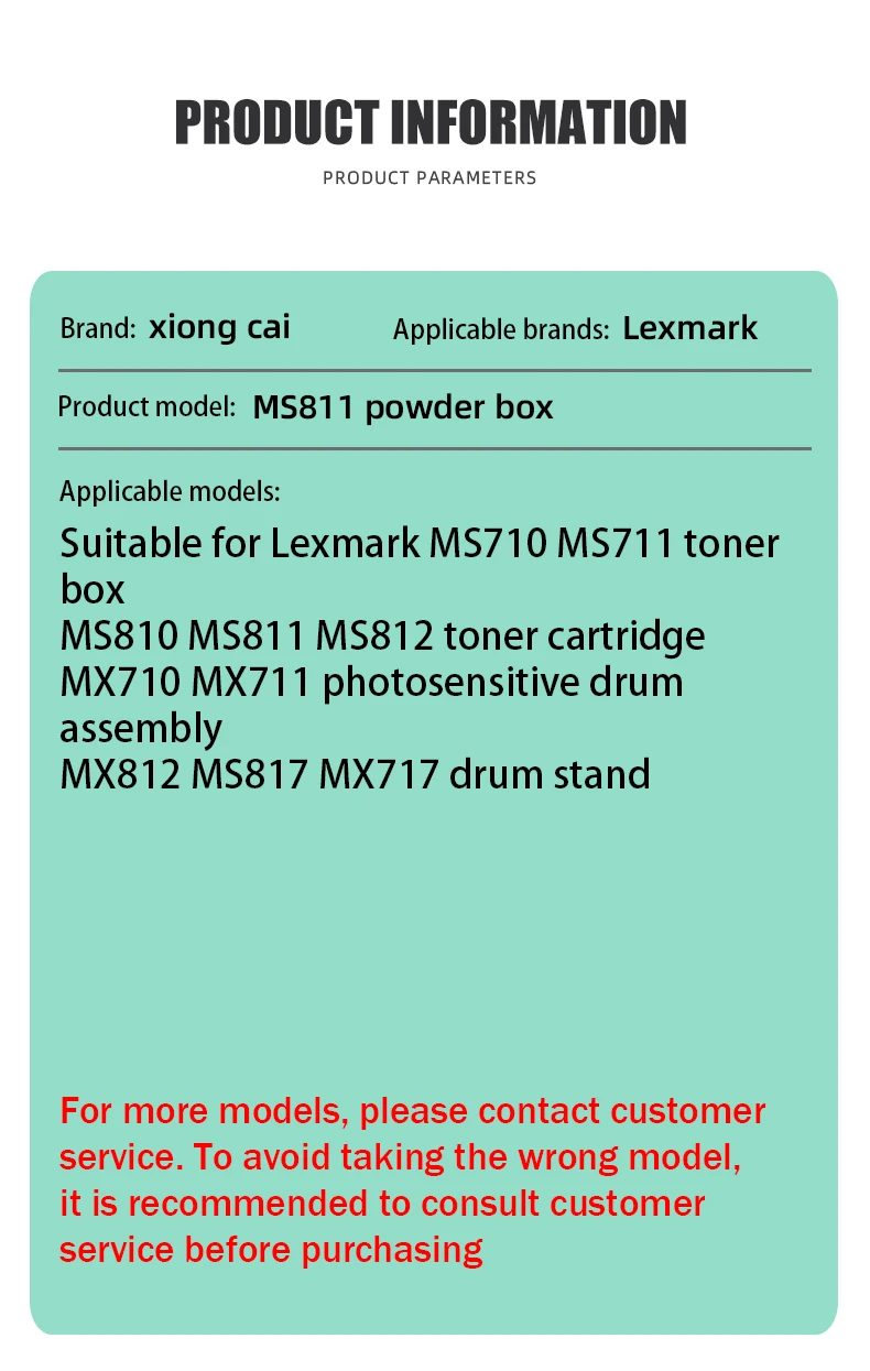 Introducción del producto Nombre del producto:Caja de polvo MS810 Modelo de producto:MS810/811/812 Color del producto:Negro Modelo aplicable:Adecuado para Lexmark MS710 MS710de MS710dn MS711 MS711dn MS810 MS810de MS810dn Ms810dtn 810n MS811 MS81ldn MS811de MS811N MS812de MS812dn MS812N MX71ldn MX81ldn MX812d