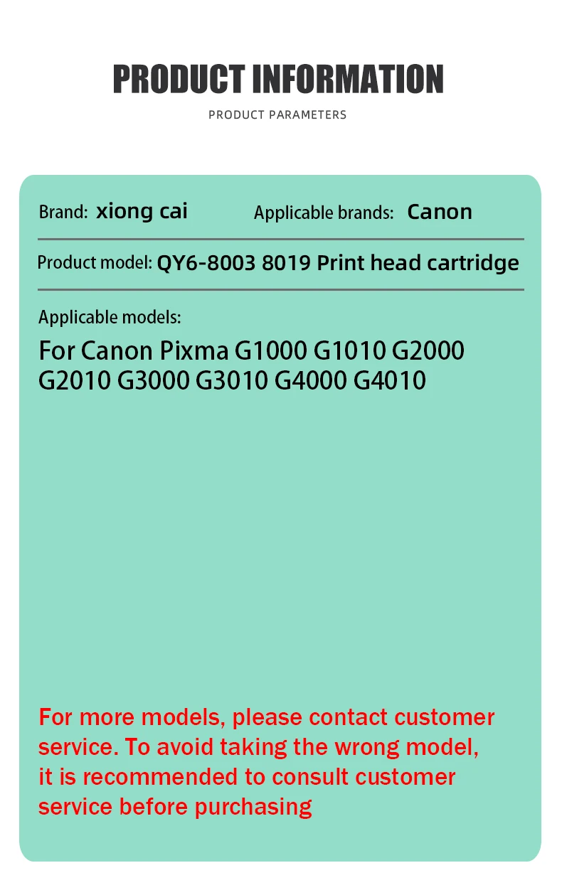 Nombre del producto: cartucho del cabezal de impresión Número de cartucho: QY6-8003/CA91 QY6-8019/CA92 Color: negro, color Modo adecuado: Para Canon Pixma G1000 G1010 G2000 G2010 G3000 G3010 G4000 G4010