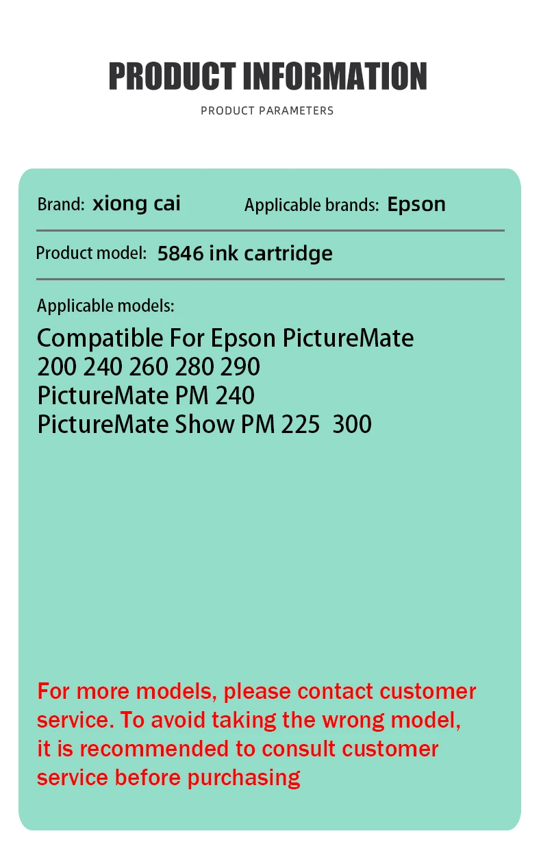 Nombre del producto: cartucho de tinta Marca aplicable: Compatible con Epson Número de cartucho: T5846 Color: negro, cian, magenta, amarillo (cartucho de una pieza) Cantidad de tinta: 48ML Modo adecuado: Compatible con Epson PictureMate 200/240/260/280/290 PictureMate PM 240 PictureMate Show PM 225/300