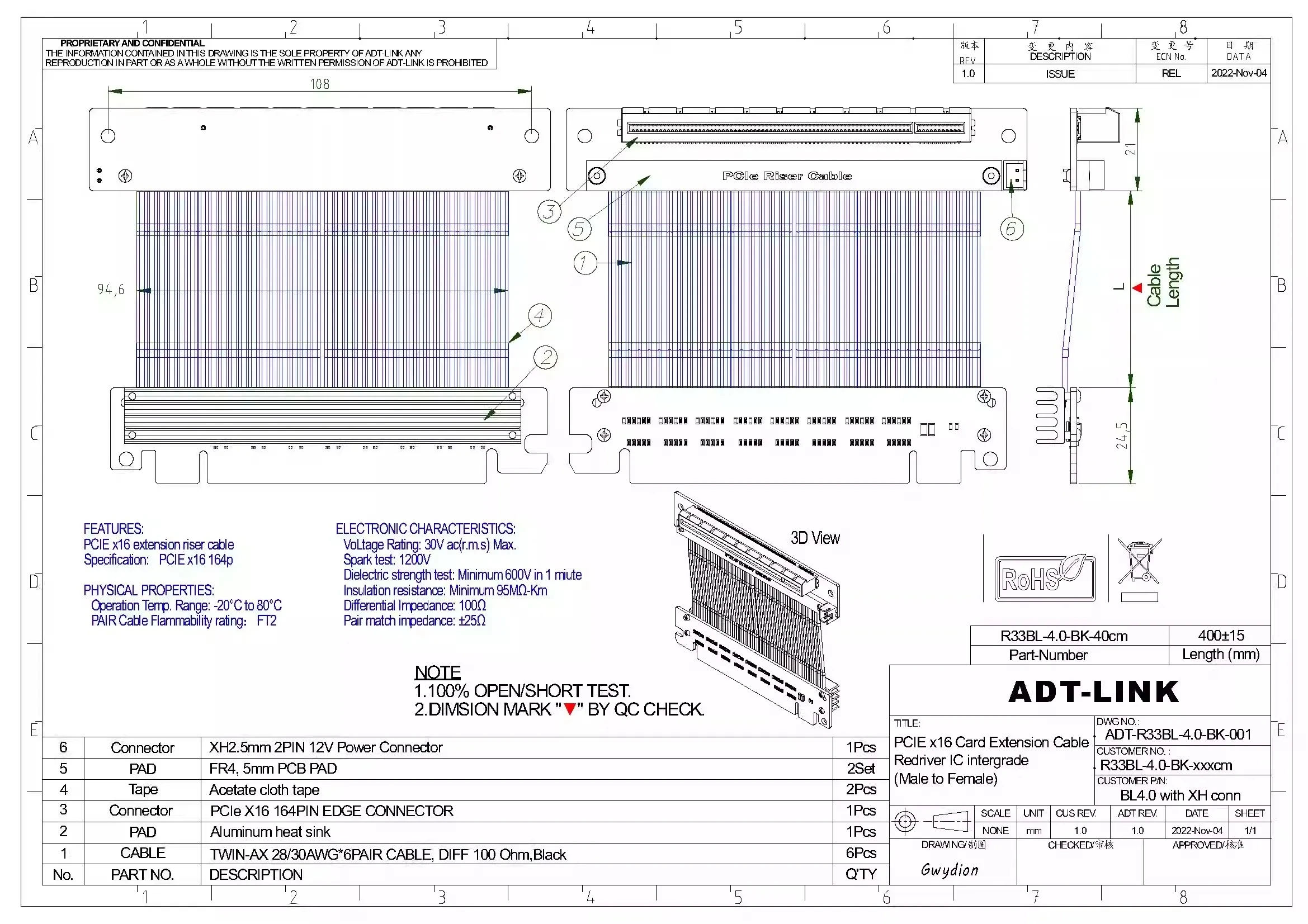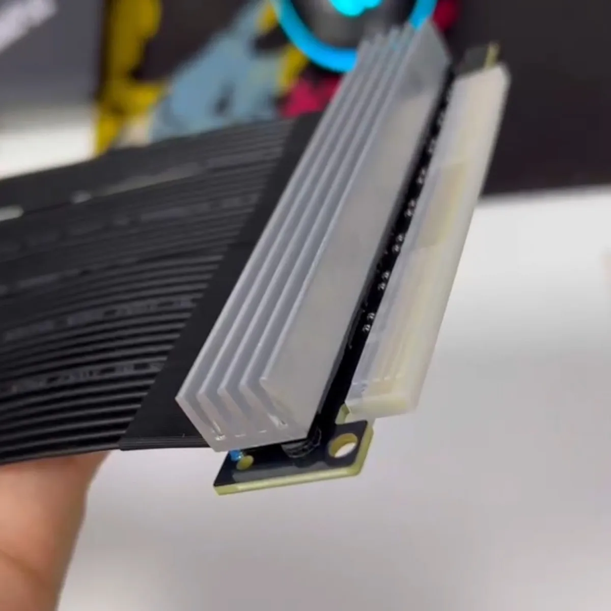 El cable es el cable dedicado PCIe de quinta generación desarrollado y diseñado por ADT. El grosor del cable negro es de 1,3mm y el grosor del cable plateado es de 1,4mm.