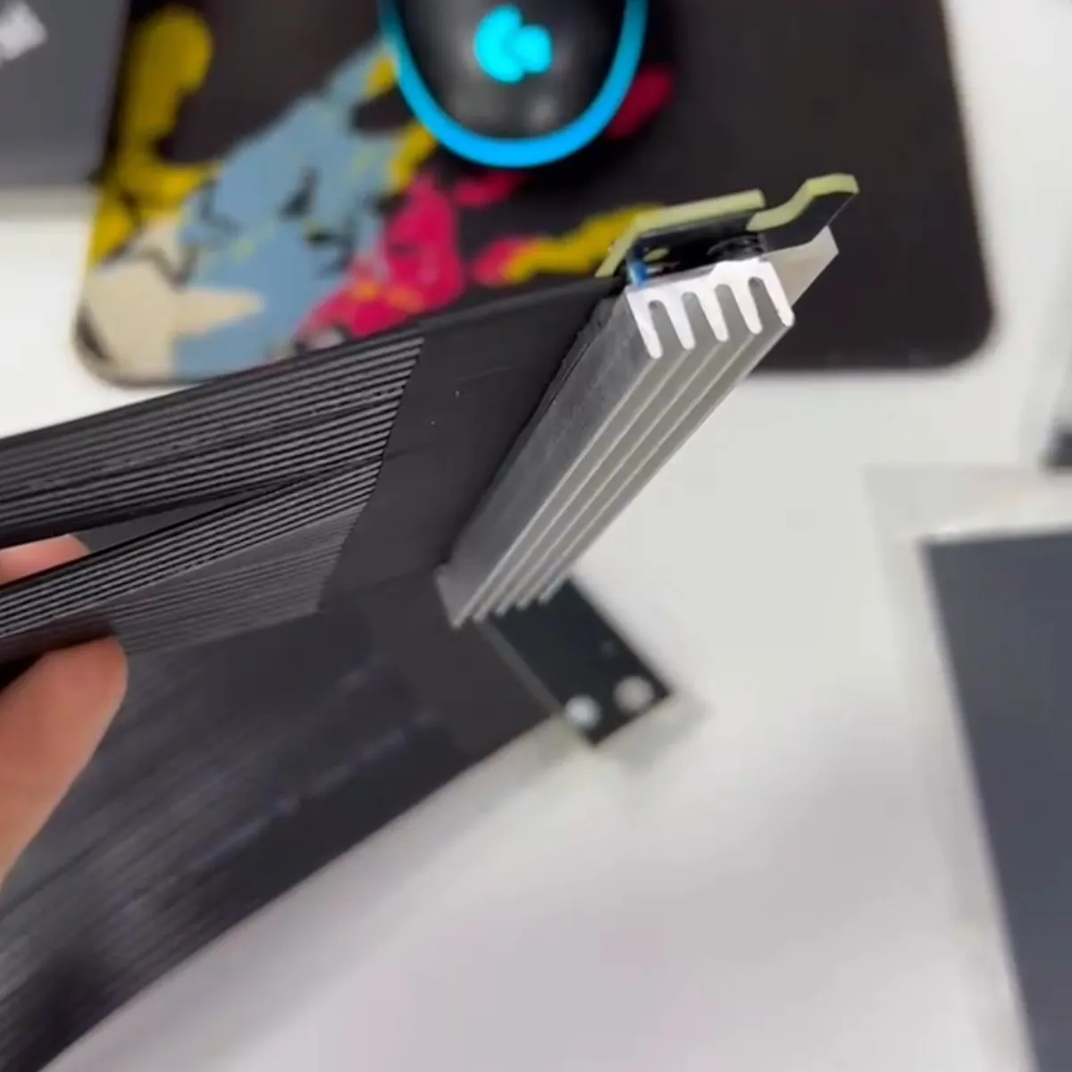 El cable es el cable dedicado PCIe de quinta generación desarrollado y diseñado por ADT. El grosor del cable negro es de 1,3mm y el grosor del cable plateado es de 1,4mm.