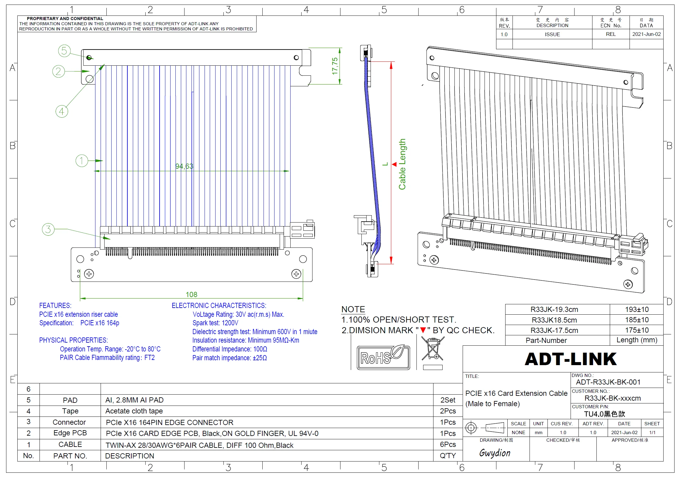 PCI Express adt-link4,0/5,0Cable de extensión x16 para chasis ITX A4