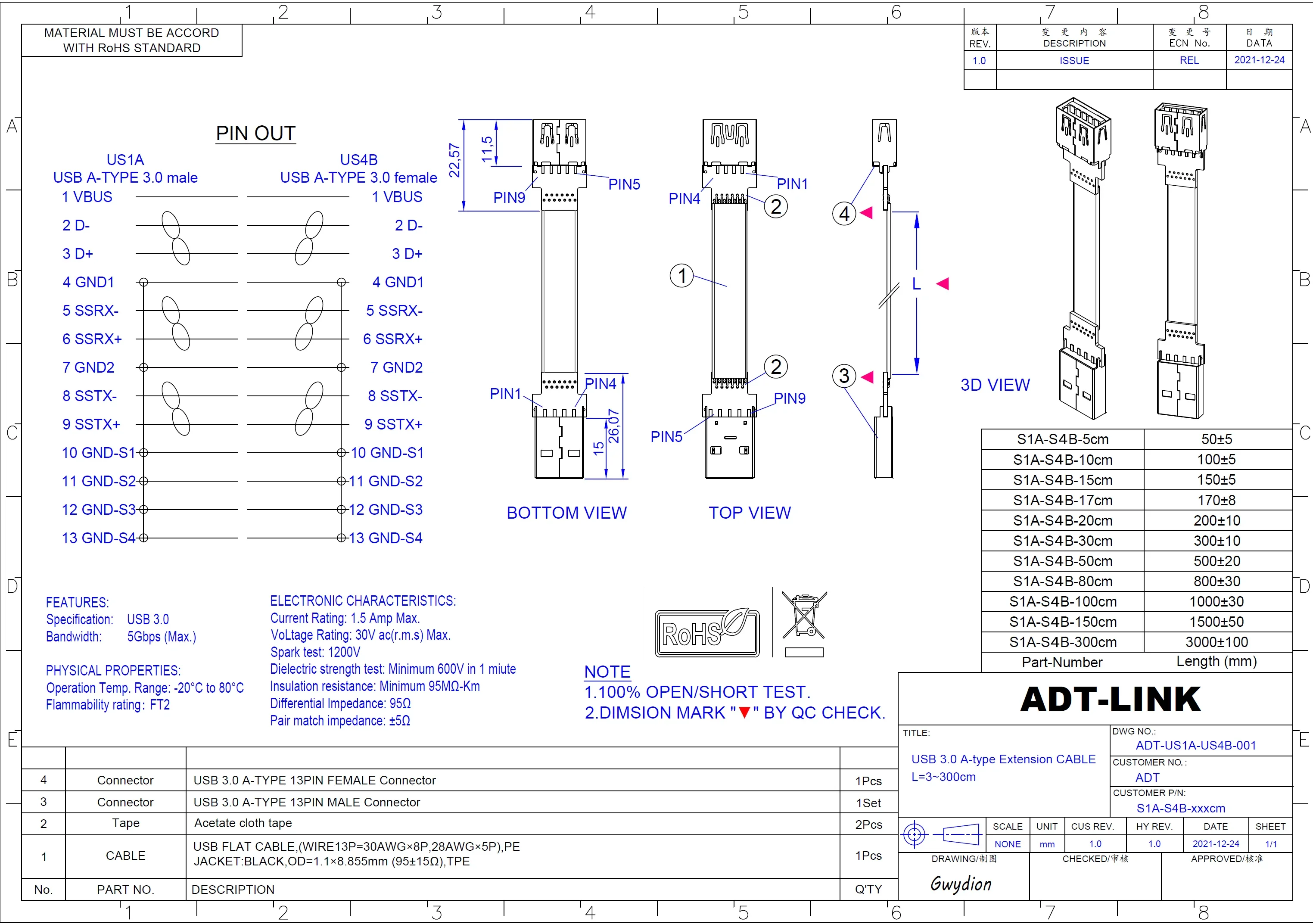 Nombre del producto: cable plano USB 3,0 tipo A macho a tipo A hembra