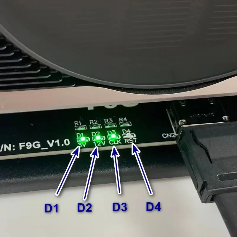 El dispositivo es sólo una luz en la que D1 representa la detección de cables;D2 representa el estado de suministro de energía de la base gráfica;la luz está encendida para marcar el inicio de la base gráfica;D3 no se enciende cuando se utilizan algunas tarjetas gráficas AMD;y D4 parpadea cuando se enciende y apaga.