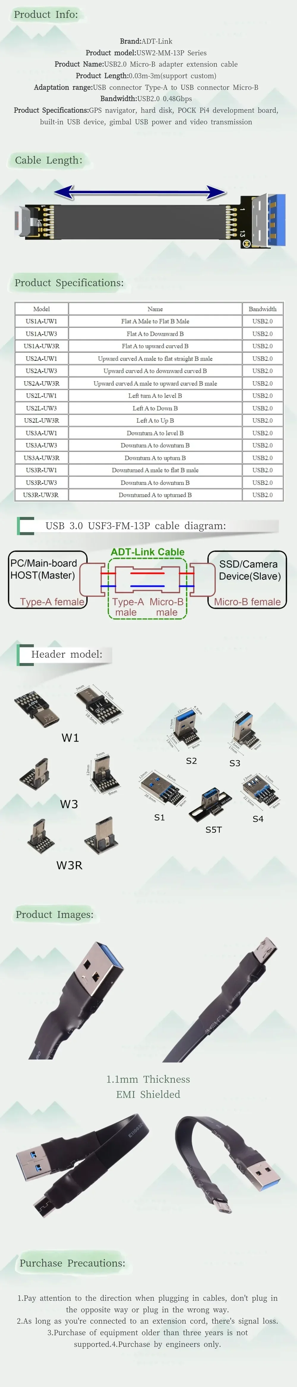 Comprar ADT-Link FPC USB 2.0 Double Bend Angle Type-A to Micro-B Male Flat FPV Power Video Data Cable Hard Drive Aerial Photography Cord