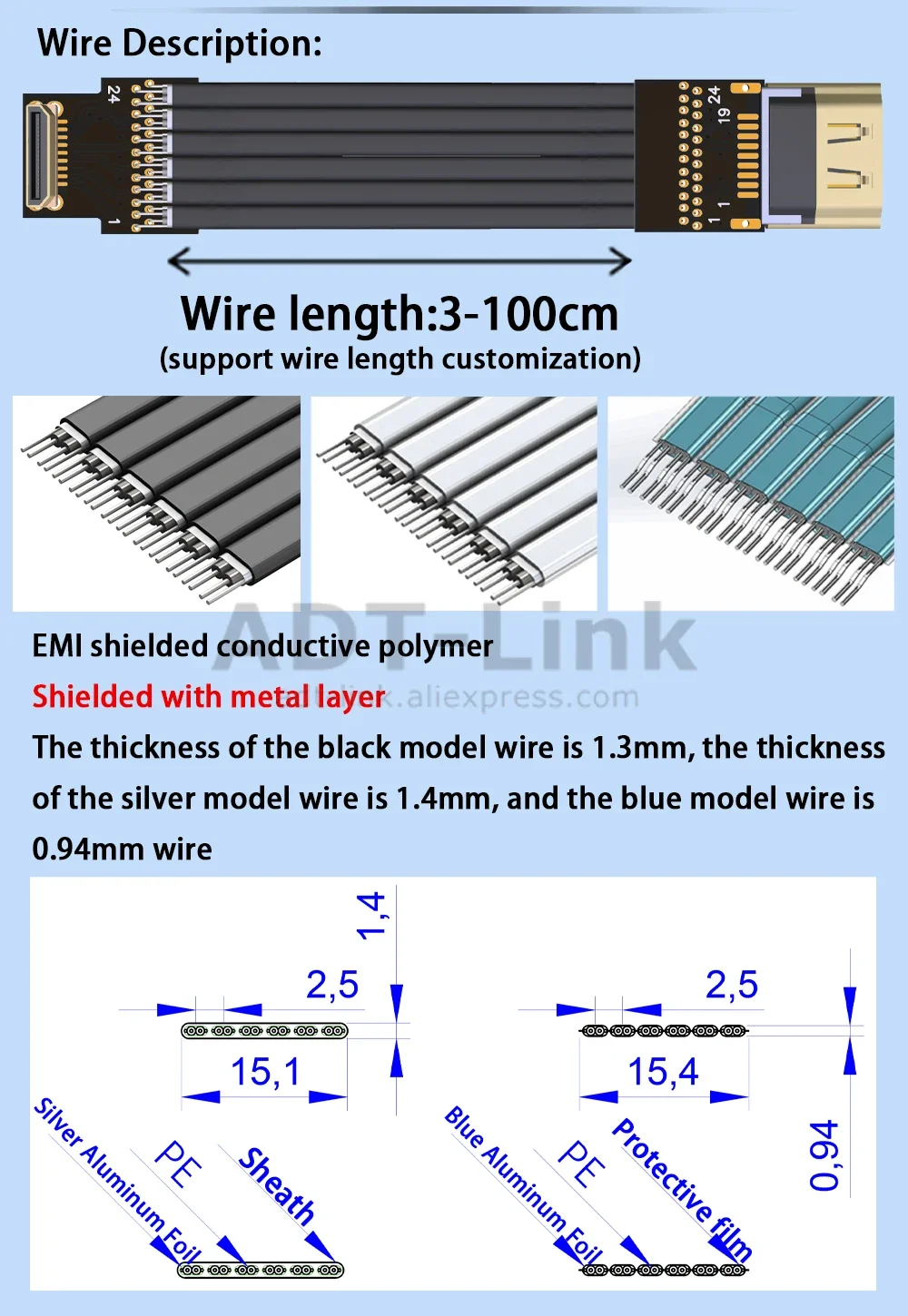 Longitud del cable: 3 ~ 200 cm, la longitud se puede personalizar,