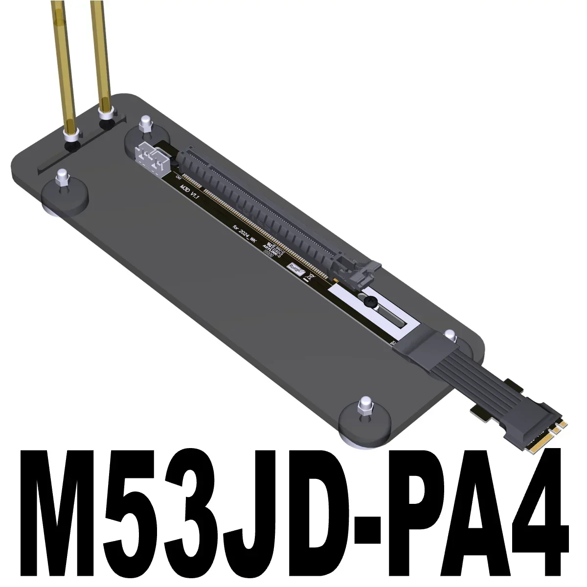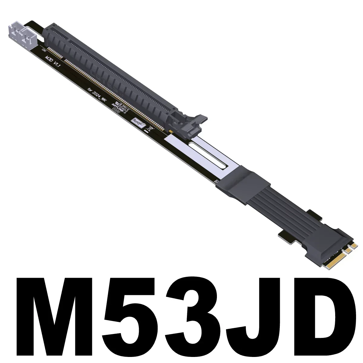 Part-NumberDescriptionBandwidthM53JDM.2_A.E. to PCIe x16 connector turn 90 degree upright right angle extension cablesPCIe 4.0 x1 (8G/bps)M53JCM.2_A.E. to PCIe x16 connector turn 180 degree splint vertical extension cablesPCIe 4.0 x1 (8G/bps)Accessories description: