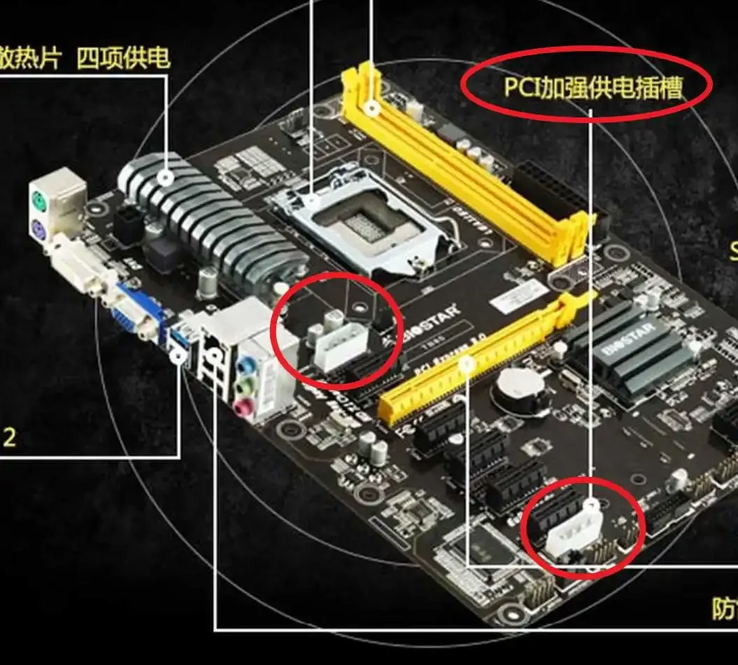 La fuente de alimentación externa del cable de extensión es para resolver el problema del suministro de energía insuficiente de la placa base. Si su placa base tiene dos puertos de fuente de alimentación mejorados PCIe y están conectados de forma segura, entonces mi cable de extensión se puede conectar a la fuente de alimentación. Conecte el cable de alimentación a la interfaz de fuente de alimentación mejorada de la placa base como se muestra en el círculo rojo: