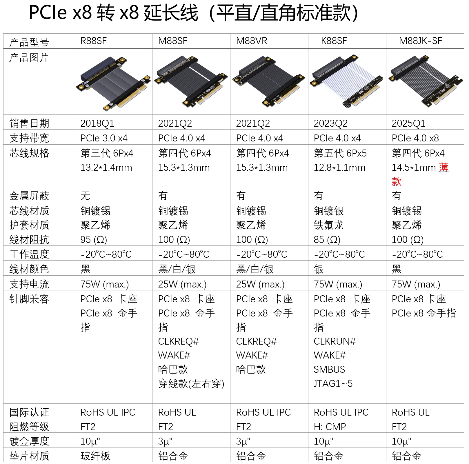 Número de piezaDescripciónAncho de bandaM88SLCable de extensión de ángulo recto vertical de 90 grados PCI-E x8 a x8esPCIe 4.0 x8 (128G/bps)M88SFPCI-E x8 a x8 gira cables de extensión verticales con férula de 180 gradosPCIe 4.0 x8 (128G/bps)M88VRM88: PCIe x8 a x8