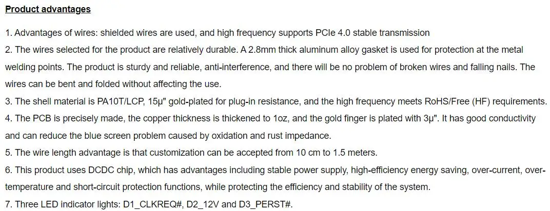 Restricciones de uso: PCIe 4.0 tiene altos requisitos en el equipo.Mientras el cable de extensión esté conectado, la señal se atenuará.Este producto no garantiza la máxima velocidad de PCI-E 4.0.El equipo está envejeciendo.Si la señal es baja o el entorno no es bueno, reduzca la velocidad a PCIe 3.0 o inferior.