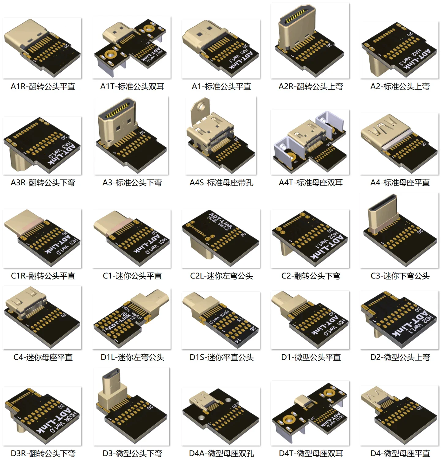 A1, A2, A3, A4, C1, C2, C3, C4, D1, D2, D3, D4, hay un total de 12 tipos de conectores HDMI disponibles en nuestra tienda.Los siguientes conectores se pueden organizar y combinar arbitrariamente y se pueden personalizar.