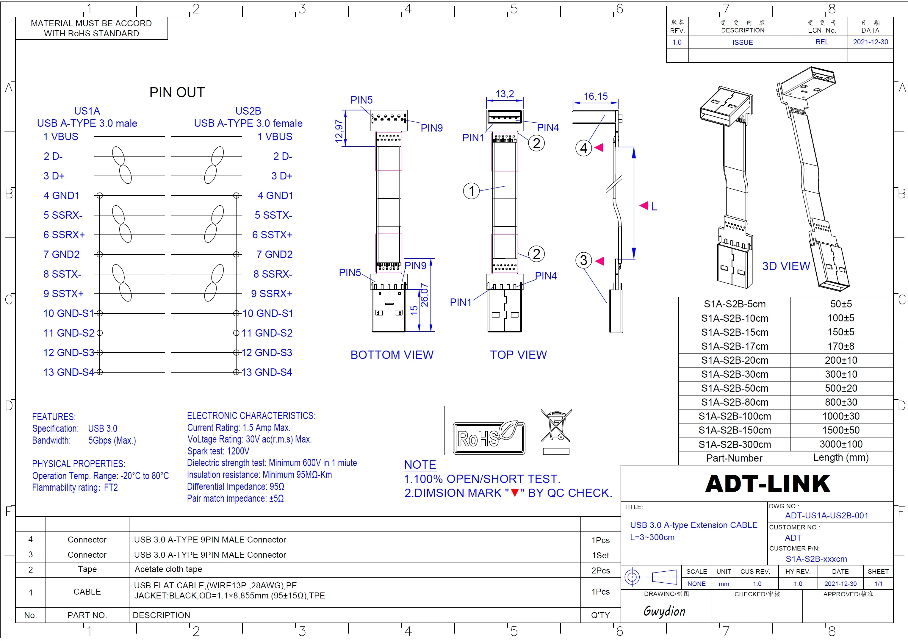 Comprar ADT personalizado 3-300CM 5G/bps plano Flexible USB 3,0 tipo A macho a un macho Cable adaptador de extensión USB 3,0 Cable de extensión de doble curva