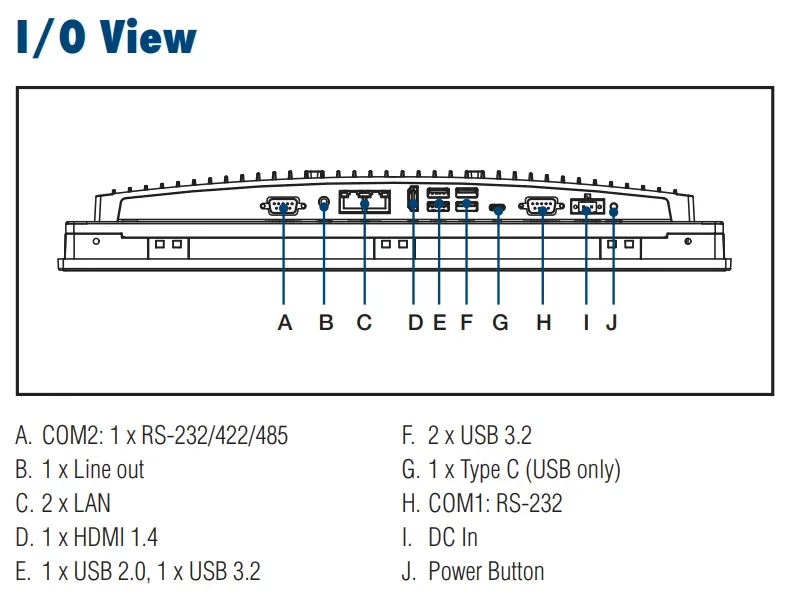 * 1x2, 1x2/422/485, 3 x USB 3,2, 1 x USB 2,0, 1 x tipo C, 1 x HDMI, 1 x salida de línea