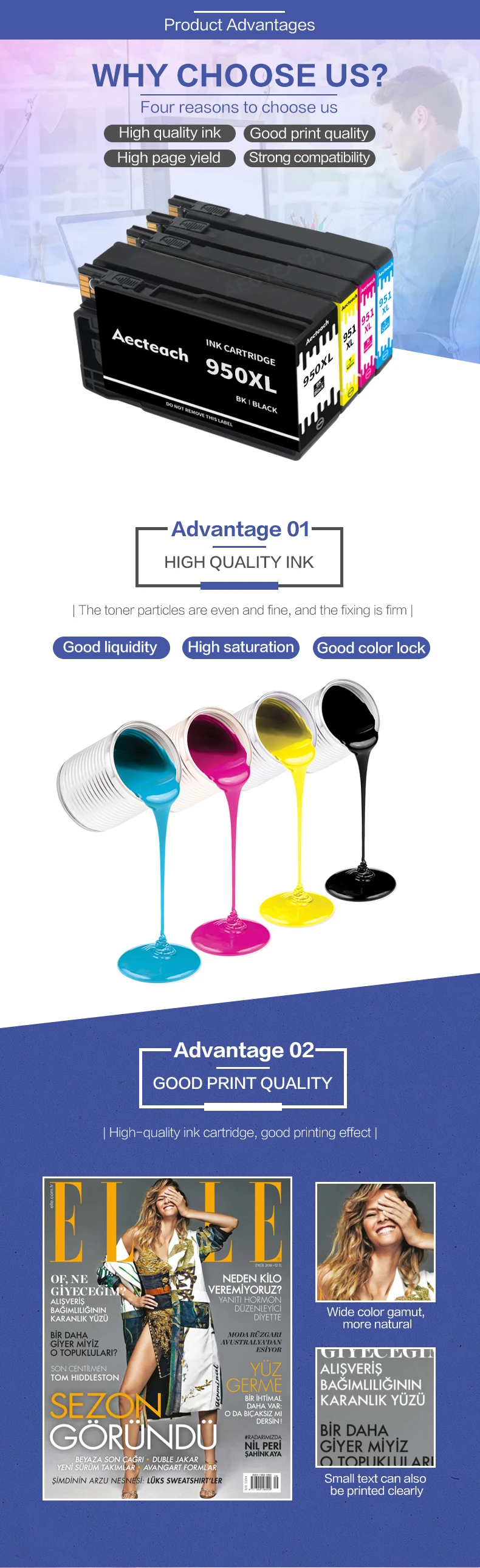 Modelo: 950 951 XLColor: Negro, cian, magenta, amarilloVolumen: BK: 55ml C, M,Y: 30ml para cada cartuchoChip: con chipEstado de los cartuchos: lleno de tinta de tinte
