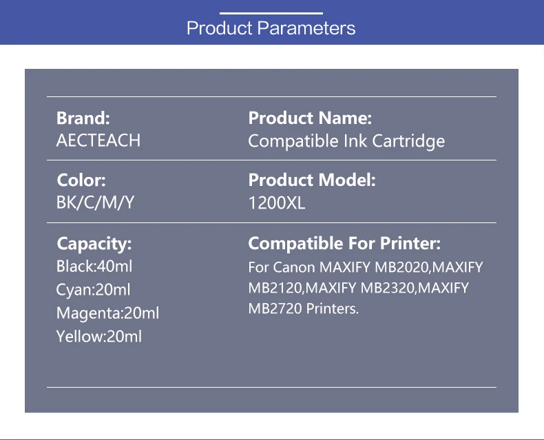 Modelo: PGI1200XLColor: negro, cian, Magenta, amarilloVolumen: BK:40ml C, M,Y: 20mlChip: con chip