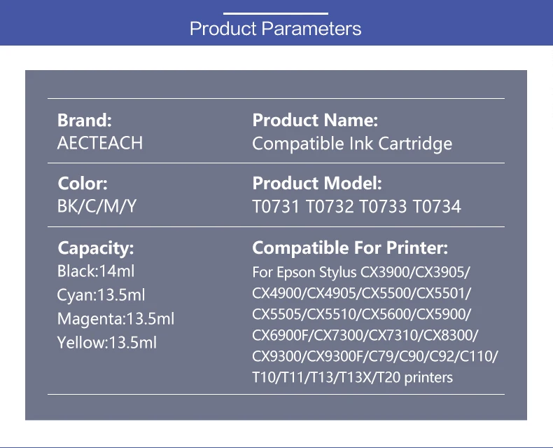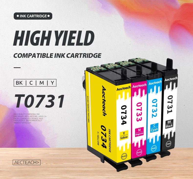 Modelo: T0731XLColor: negro, cian, magenta, amarilloVolumen: BK: 14 ml C, M, Y: 13,5 mlChip: Con chip