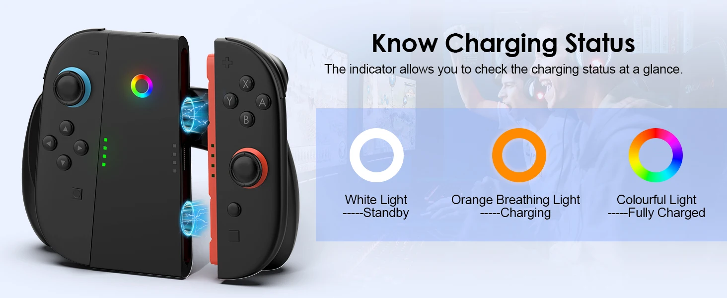 Indicador de carga multimodo: durante la carga, el indicador de carga LED redondo cambia de luz blanca de espera a luz de respiración naranja.Cuando el controlador esté completamente cargado, la luz indicadora cambiará exclusivamente a siete colores.Las cuatro luces indicadoras en el centro de dos filas son pantallas luminosas para los papeles asignados de los reproductores del controlador izquierdo y derecho, lo que brinda una experiencia de juego cómoda y cómoda.Szkoston