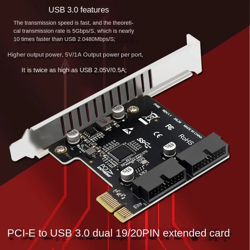 Placa extendida PCI express x1 PCIe a USB 3,0 Dual 19/20 pines, controlador convertidor de Panel frontal de chasis PCI-E, PCI-e 1x tarjeta adaptadora de expansión USB3 0 Especificaciones:: Nombre: PCI-e a USB 3.0 tarjeta de expansión dual 19/20P Interfaz de entrada: PCI-E X1 compatible con X4/X8/X16 Peso del producto: 30,6G Cumplir con la especificación básica de PCI EXPRESS 2.0; Cumple con la especificación de interfaz de controlador host extensible (XHCI) Revisión 1.0 Admite actualización de firmware; Compatible con USB2.0 y USB1.1; Paquete incluido: 1 * PCIe a USB3. 0 tarjeta de expansión doble 19/20P