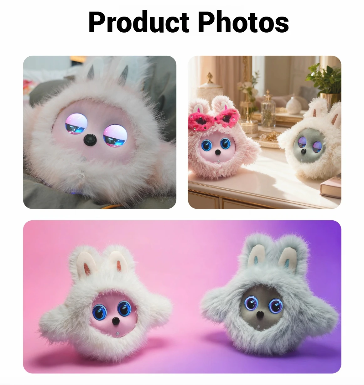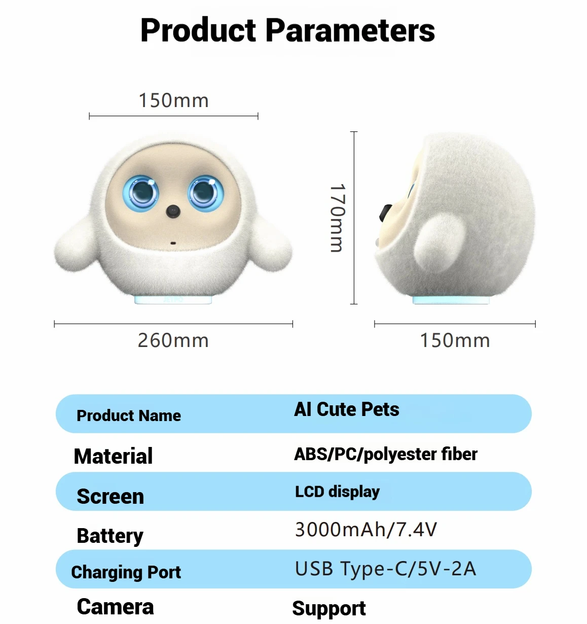 Estimado cliente, gracias por comprar este producto.Al robot mascota tiene un tacto suave similar al de una mascota, puede acceder al modelo Al multimodo de la nube en línea y comunicarse de forma inteligente con usted y responder preguntas;TA también tiene la capacidad de percibir el entorno, para que pueda interactuar con usted de manera más inteligente y expresar sus pequeñas emociones a través de acciones.expresiones y efectos de sonido.Espero que TA pueda acompañarte y traer alegría a tu vida.