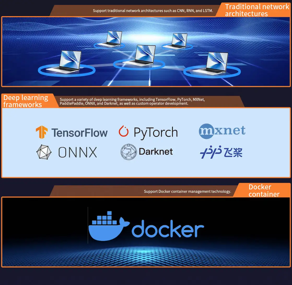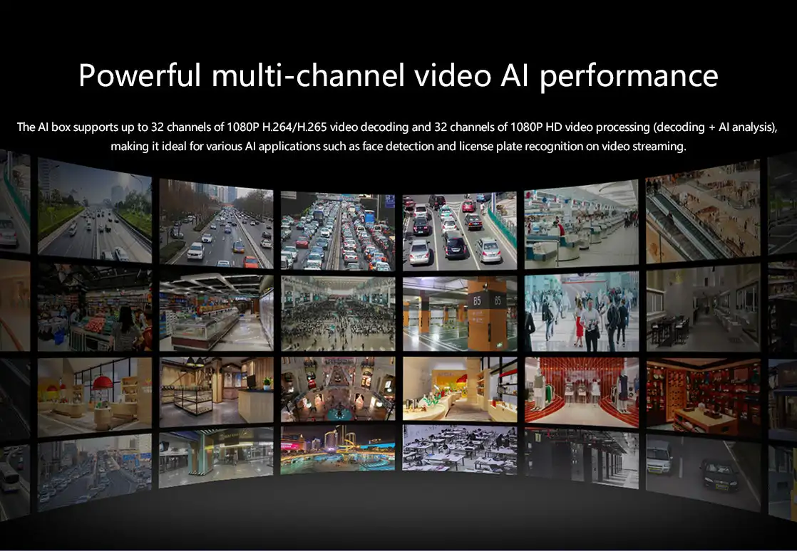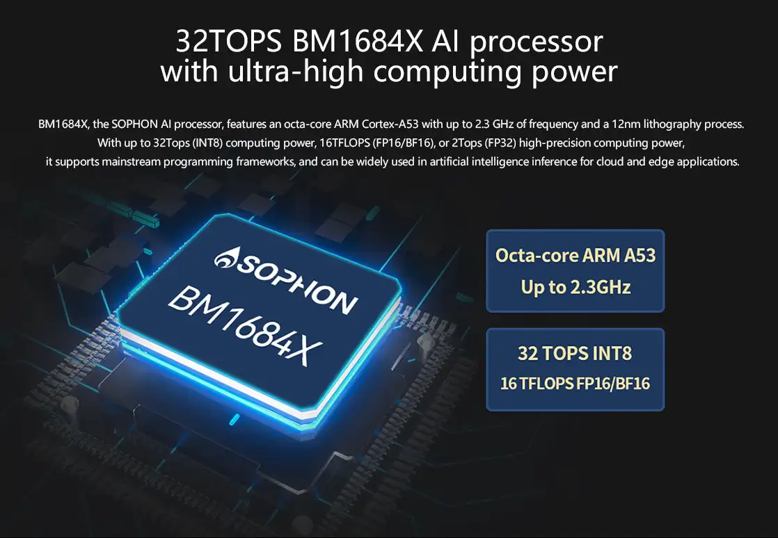 AIBOX-1684X utiliza el procesador SOPHON AI BM1684X, que se puede configurar con una memoria grande de 16 GB y eMMC de 128 GB; admite potencia de computación máxima de 32TOPS (INT8), potencia de computación de 16TFLOPS (FP16/BF16) y potencia de computación de alta precisión de 2TFLOPS (FP32); admite H de 32 canales. 265/H. 264 1080p@25fps decodificación de vídeo; admite fotogramas de programación convencionales, con una solución completa y alta facilidad de uso, y bajo costo de migración de algoritmos; Adecuado para una variedad de escenarios informáticos de IA, como computación visual, computación de borde, servicios informáticos generales, transporte inteligente, supermercados no tripulados y drones.