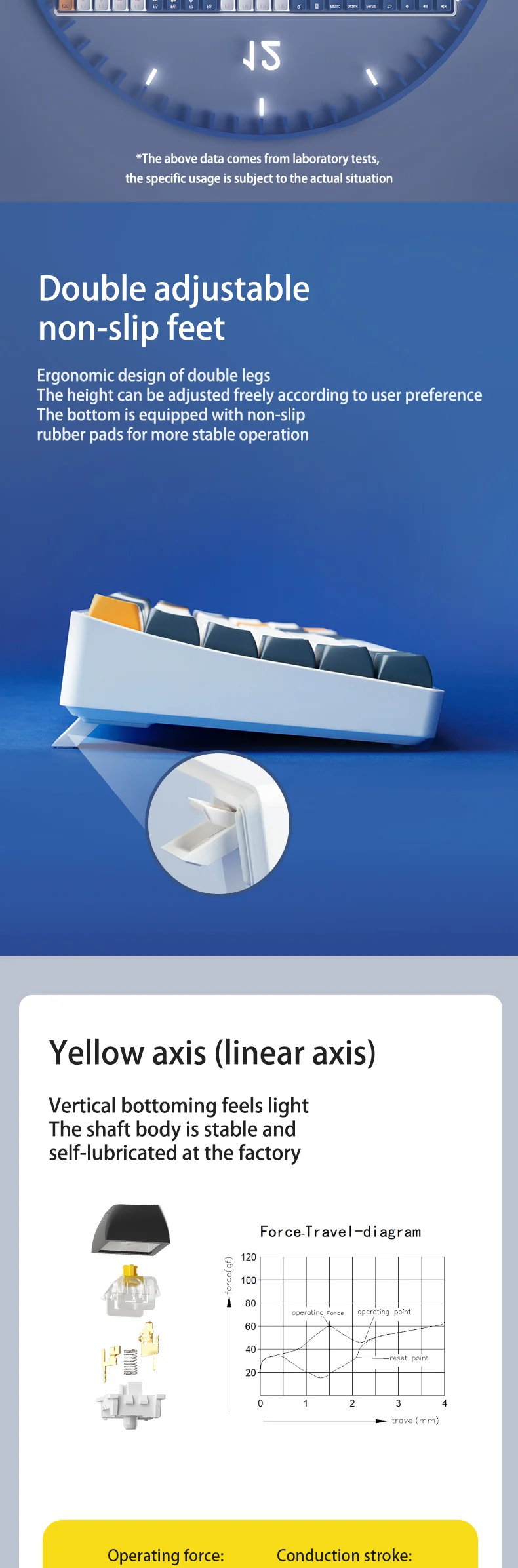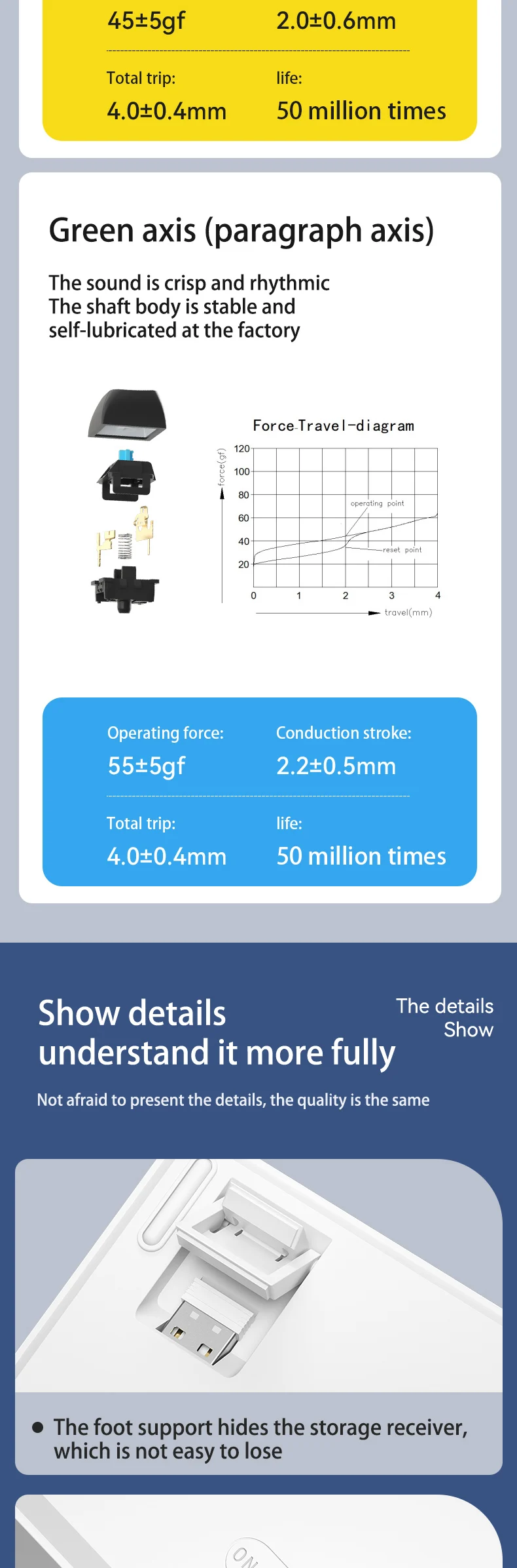 The blue switch/ Yellow switch is the most characteristic switch of the mechanical keyboard. Whether it is the sound or the feel, it can let you find a special pleasure. The double-layer 4-time paragraph feeling, the feedback of the key is self-evident, no matter the code word Whether it is a game or a game, it can emit that crisp sound and rhythm, which is endless aftertaste. 50 million keystroke life makes you worry-free!