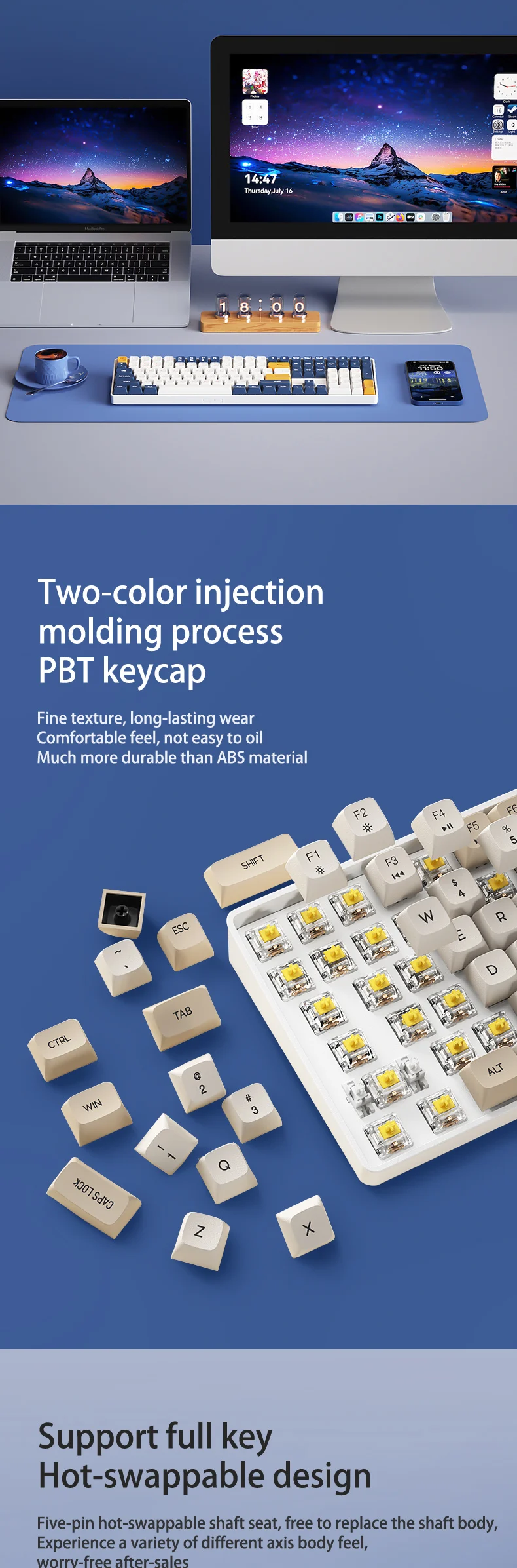 8. PBT keycaps. Two-color injection molding process, long-term wear resistance, fine texture.