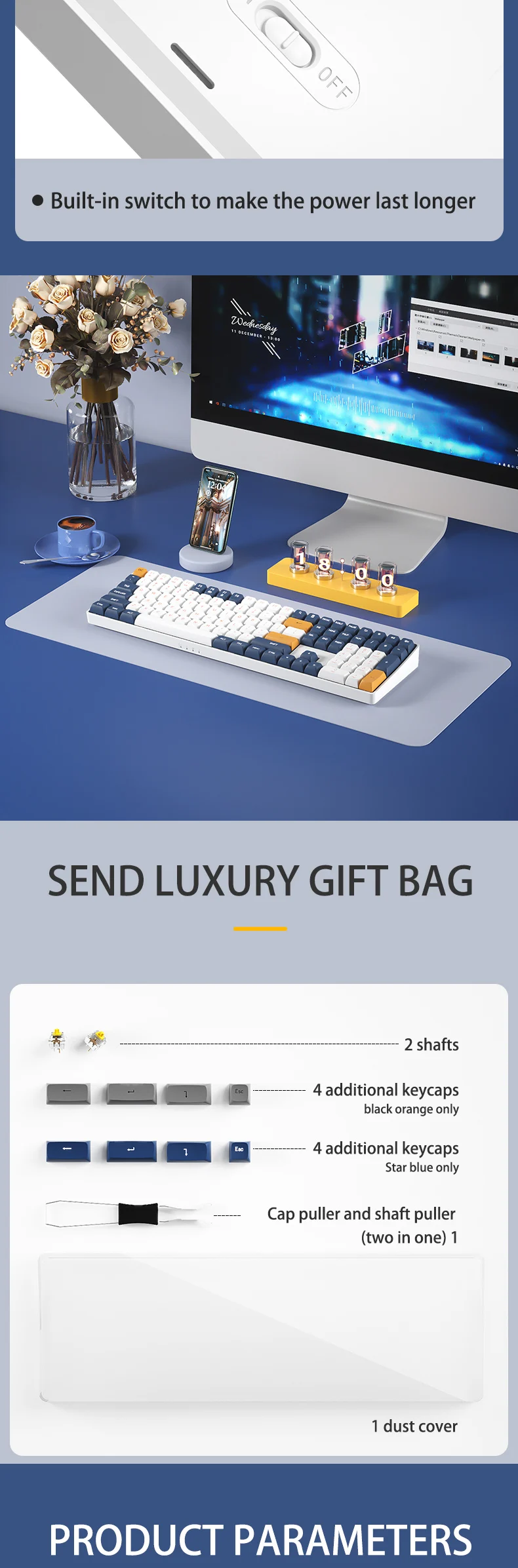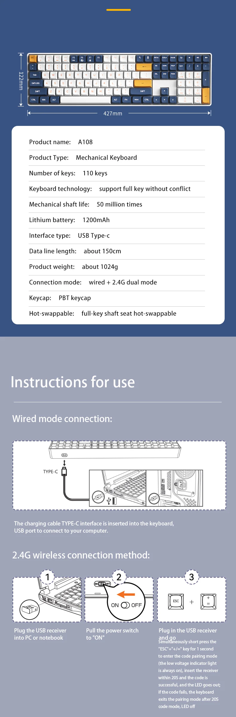 7. Layout: 110 keys, compact layout design, greatly saving the use of space.