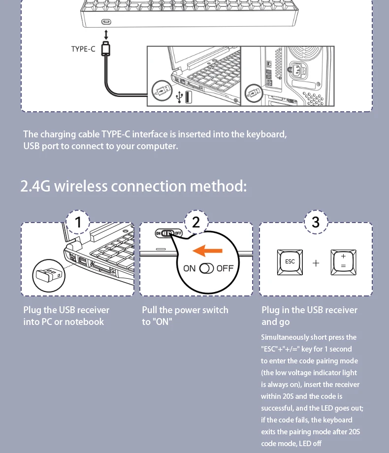 6.Método de conexión: 2,4G con cable e inalámbrico.Según sus hábitos de uso, cambie el modo de conexión a voluntad.