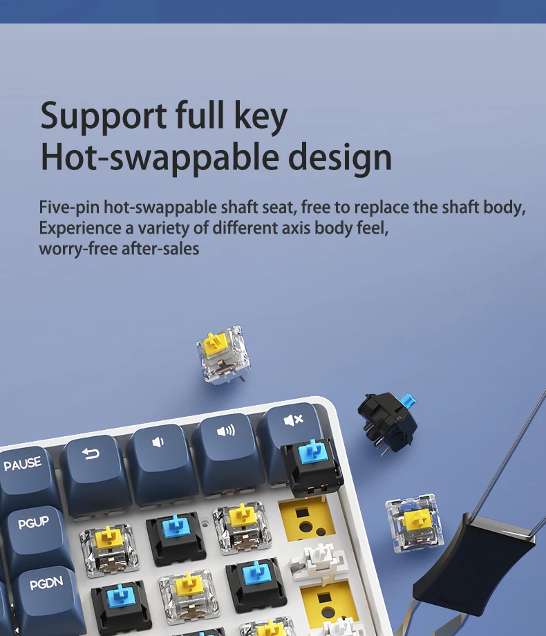 9.Admite diseño de llave completa intercambiable en caliente.El asiento del eje intercambiable en caliente de tres patas le permite reemplazar libremente el cuerpo del eje y experimentar una variedad de mangos diferentes.