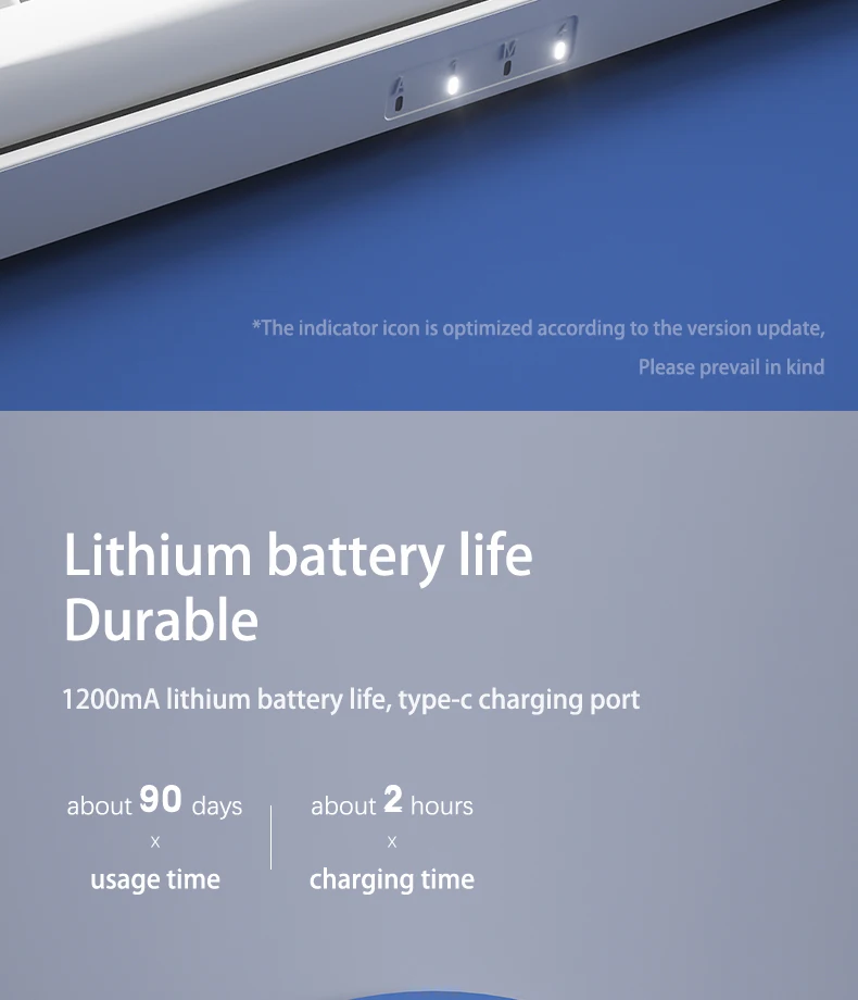 2.Batería: batería de polímero de litio recargable de 1200 mAh.¡Cargando durante 2 horas, trabajando durante 90 días!(Los resultados de las pruebas de laboratorio pueden variar debido al uso real).