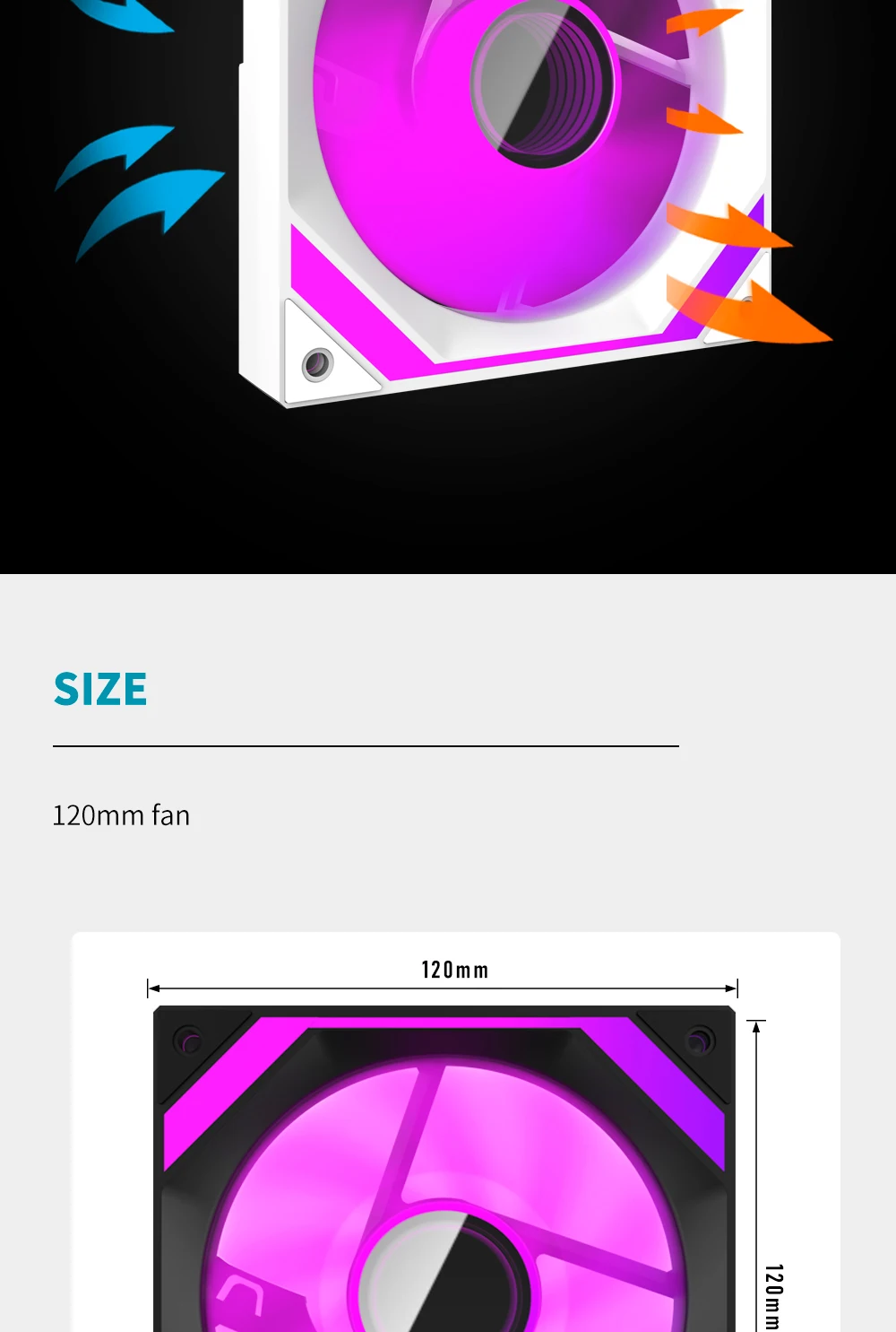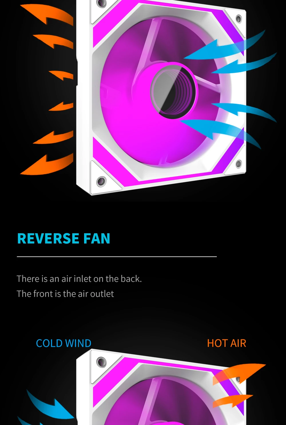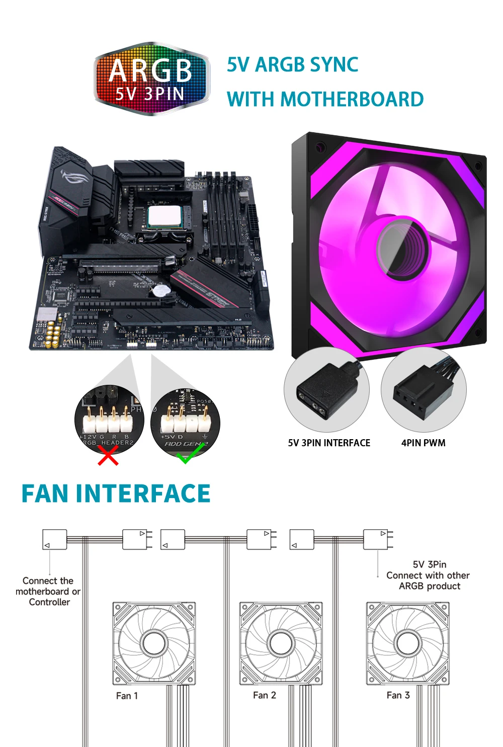 • Interfaz de potencia de 5v-3pin ARGB :La interfaz de potencia de 5v-3pin ARGB permite una conexión fácil y segura, asegurando que el ventilador funcione correctamente con su sistema.