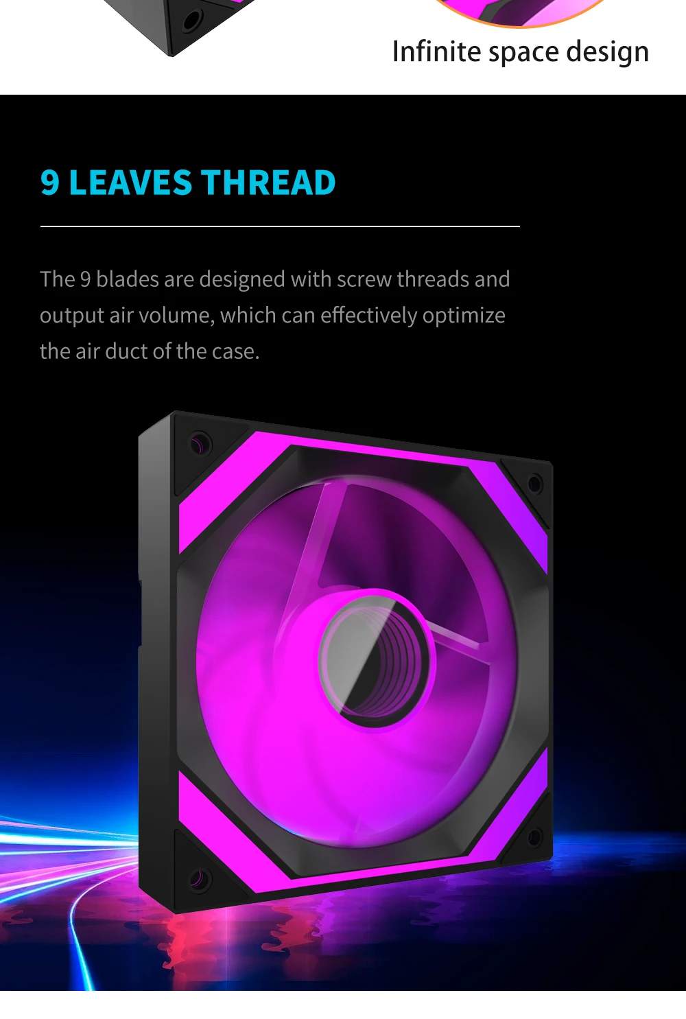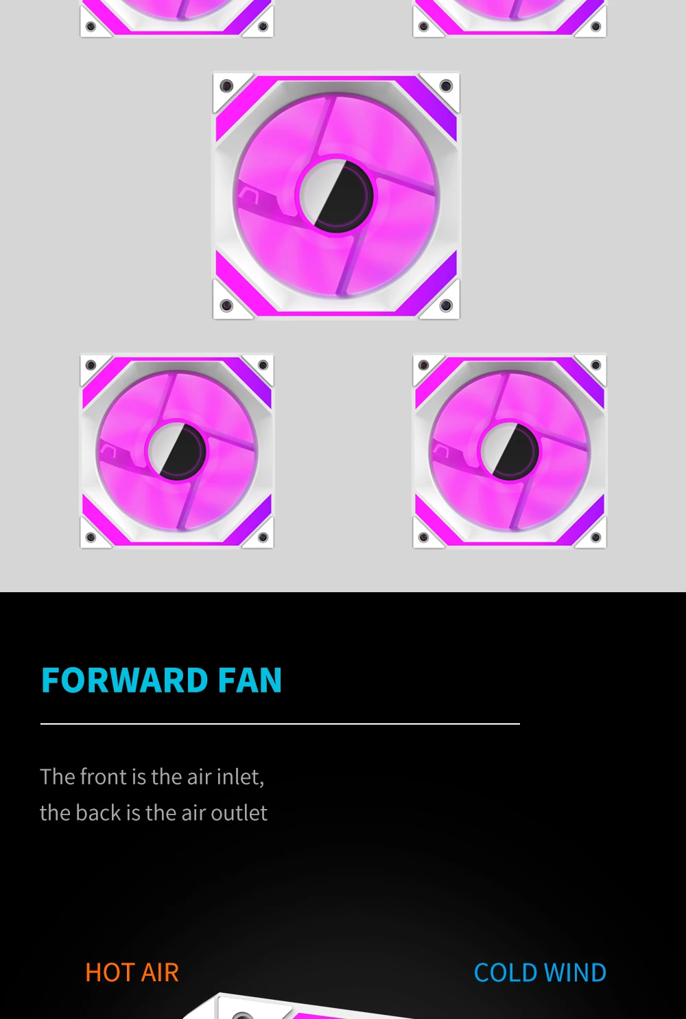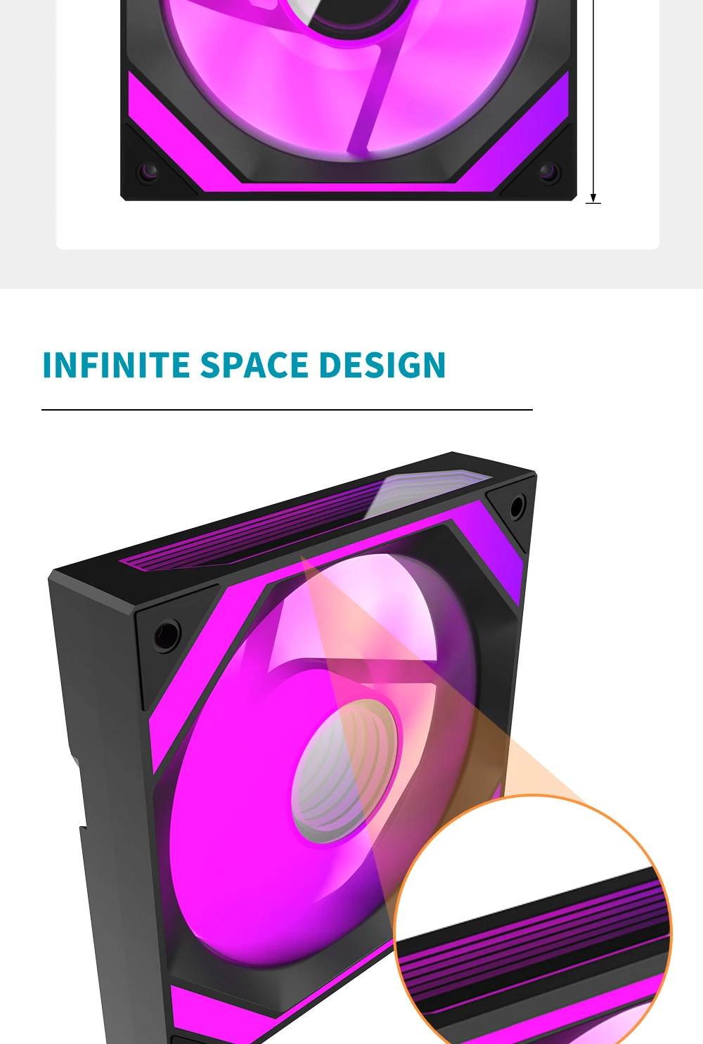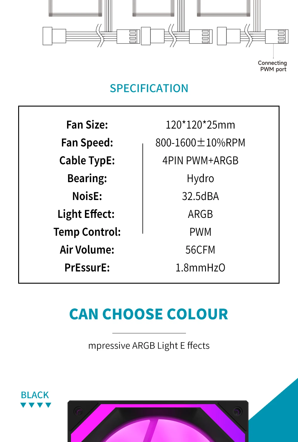 • Interfaz de potencia de 5v-3pin ARGB :La interfaz de potencia de 5v-3pin ARGB permite una conexión fácil y segura, asegurando que el ventilador funcione correctamente con su sistema.