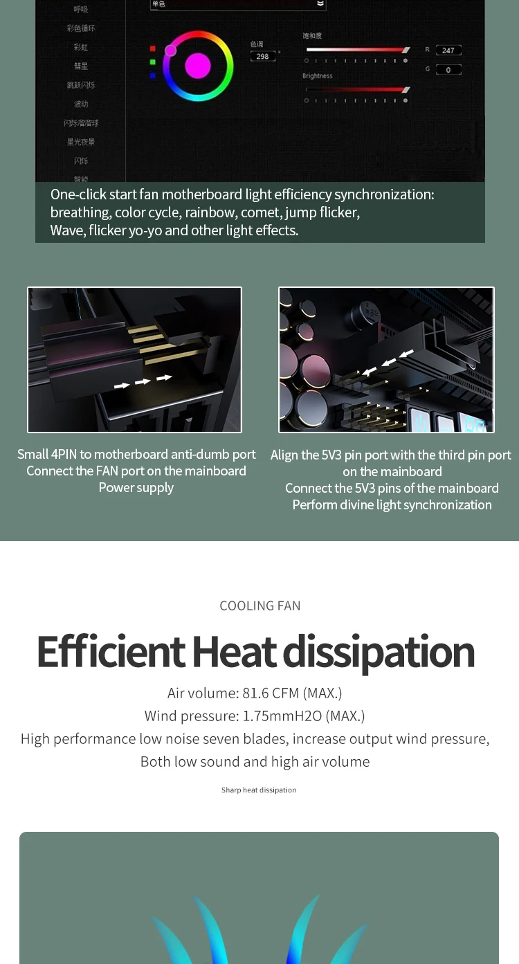 2.Antiguo amigo, si su placa base admite una interfaz de sincronización de 3 pines y 5v, entonces puede usar la placa base para controlar el ventilador.Si su placa base no admite interfaz síncrona de 3 pines 5v, le recomendamos que compre otro controlador. Puede usar el control remoto para controlar el ventilador y cambiar de color.