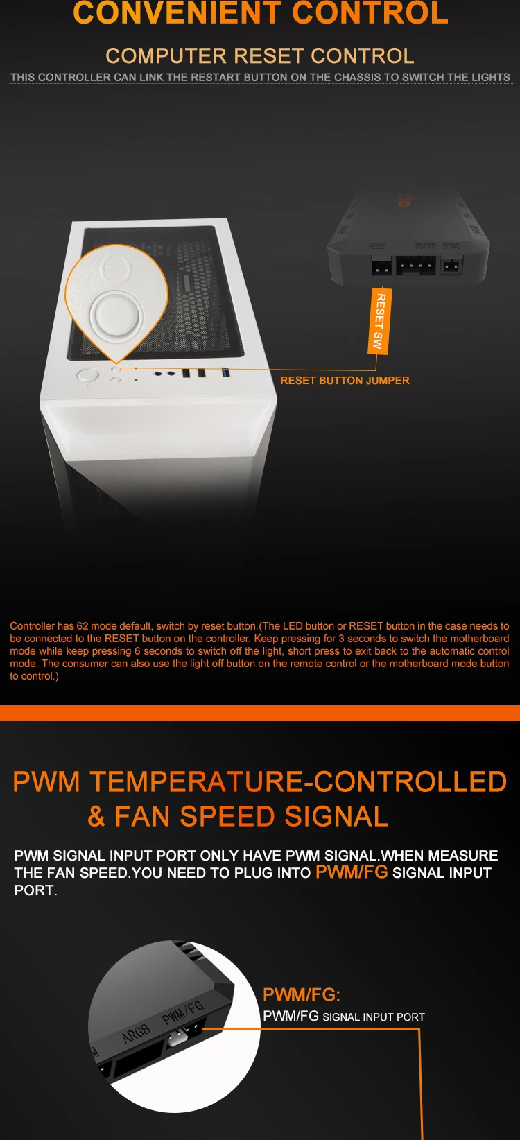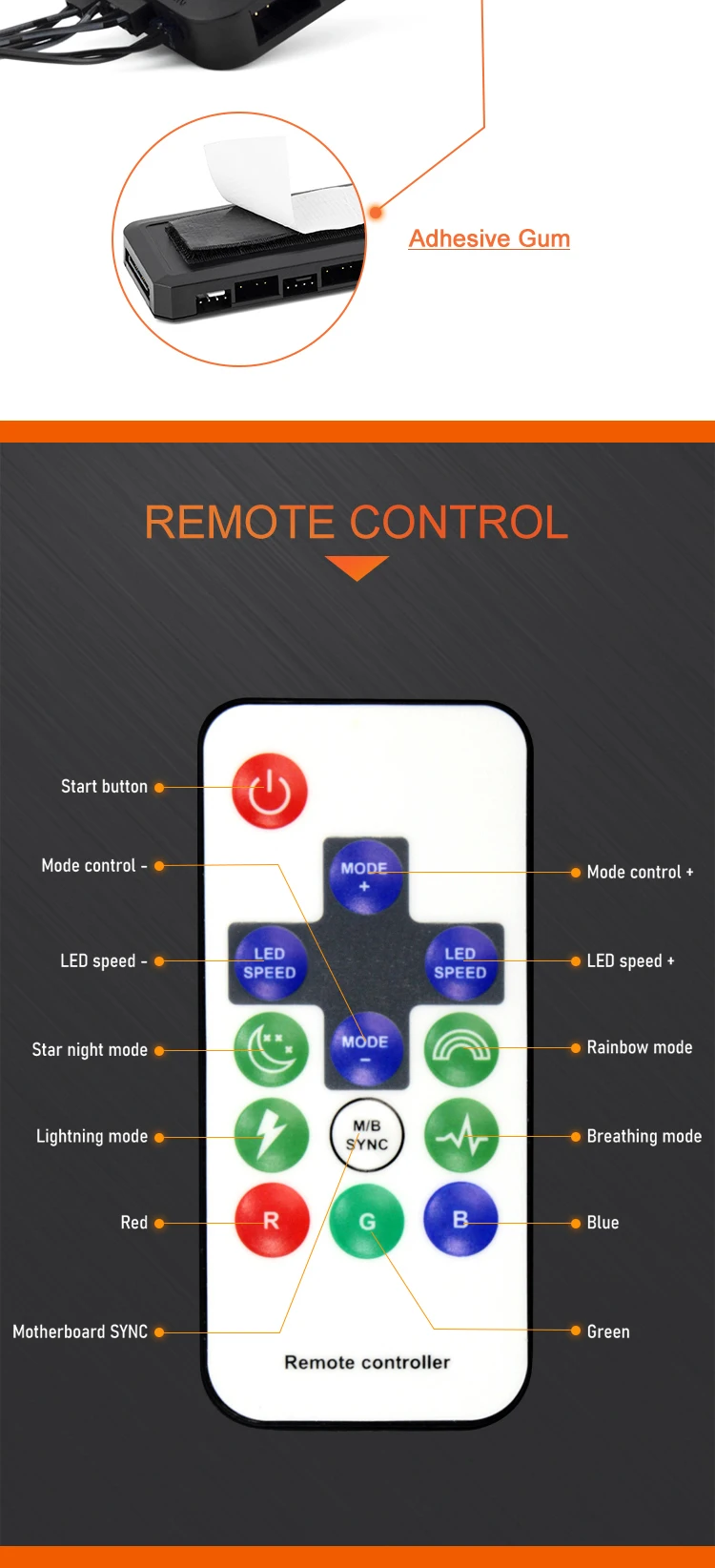 1.Este modo de conexión puede utilizar el control remoto para cambiar el modo de iluminación del ventilador, etc.(use el cable de conexión accesorio para conectar el controlador a la placa base o al chasis.En este caso, la capacidad del ventilador para cambiar el modo de iluminación se transferirá a la placa base o al chasis.El control remoto pierde el ventilador para cambiar el modo de luz).